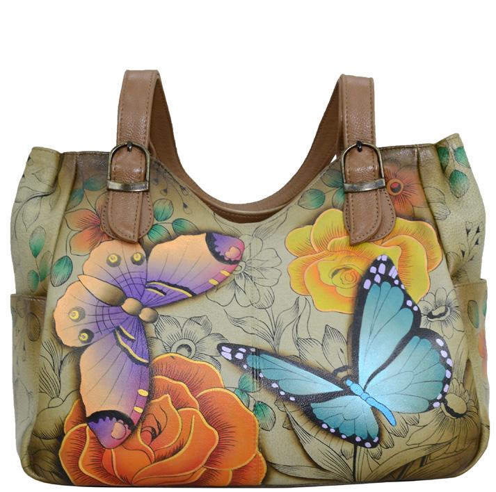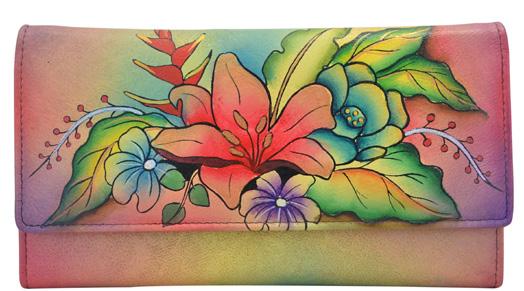 Hand painted original artwork. Genuine leather exterior and trim. Top two sided zippered entry to main compartment. Inside zippered partition pocket. Eight card holders. One zippered wall pocket two multipurpose pockets. Rear full length zippered pocket.