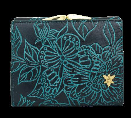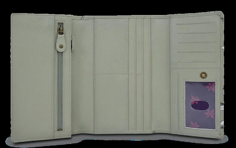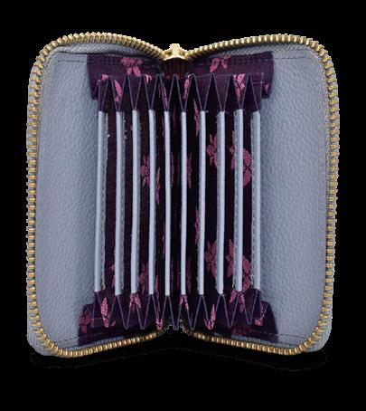Fifteen RFID protected card holders and one ID window. Rear full-length zippered coin pocket.