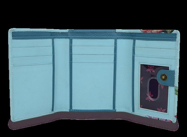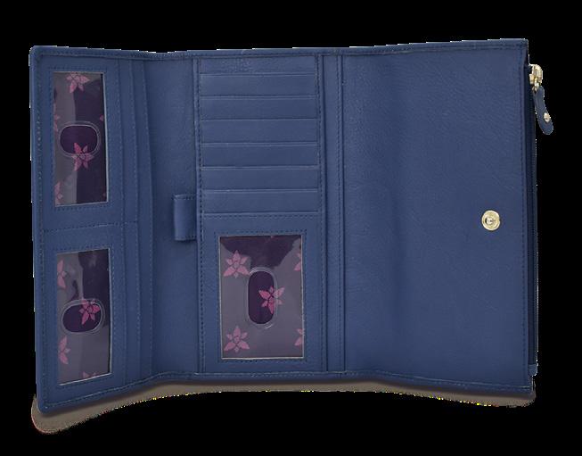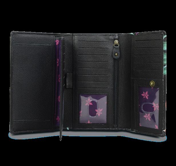 Flap with snap button entry. Fourteen RFID blocking card holders. One open compartment. Four slip-in pockets. One zippered wall pocket, two ID windows. Rear phone compartment with hook and loop fastener.