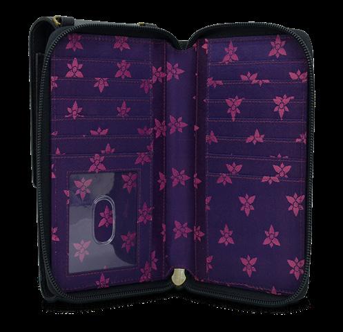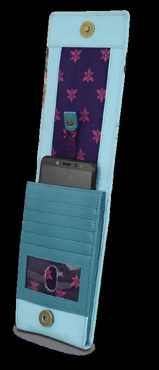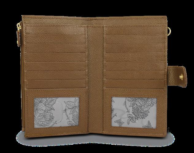 All-round zippered entry to the compartment. Eight Credit card holders, one ID window, one zippered pocket, two slip-in pockets and one bill pocket. Flap entry with snap button to phone case can fit I-phone 15 and 15 pro (pro max model without the phone case). One front slip-in pocket.
