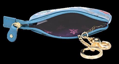 Top zip entry. Zippered wall pocket, open wall pocket, two gusseted multipurpose pockets, key fob.