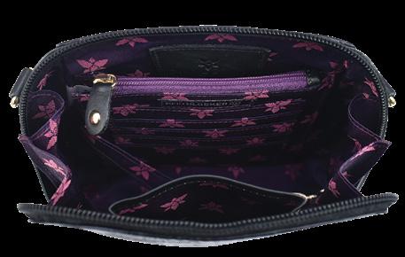 Top zip entry to main compartment. One zippered wall pocket, one open wall pocket. Two multipurpose pockets with gusset. Rear full length zippered pocket and slip in cell pocket.