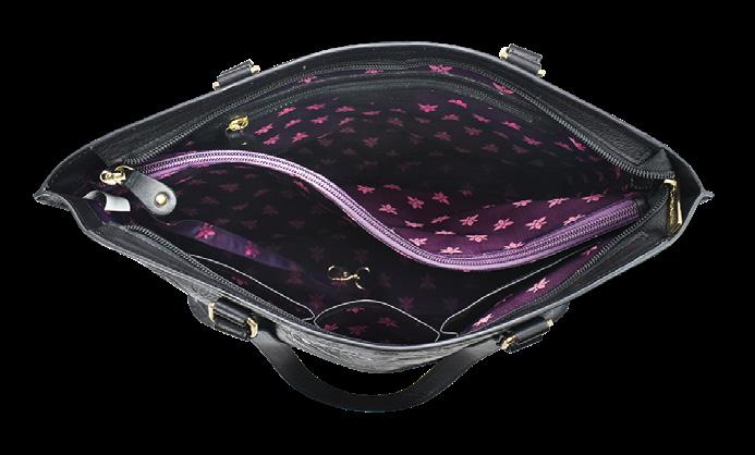 Top zip entry, one zippered wall pocket, one open wall pocket. Two multipurpose pockets with gusset. Rear full length zippered pocket and one cell pocket.