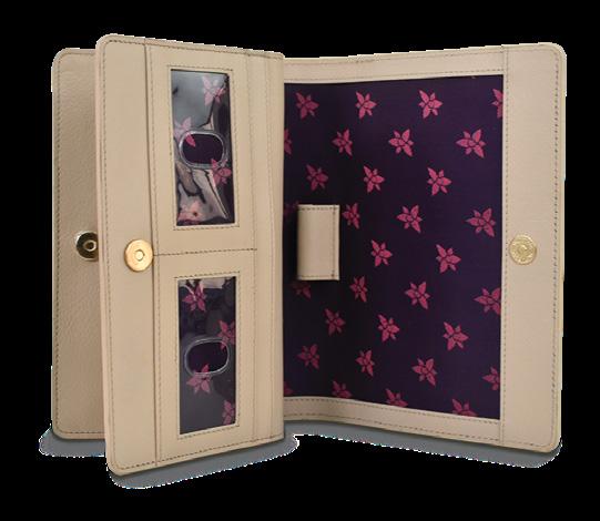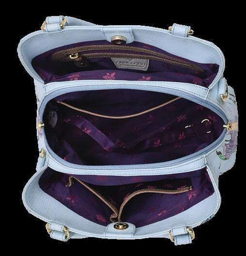 Double magnetic closure to main compartment. One open wall pocket, one zippered wall pocket, two multipurpose pockets and a zippered partition pocket. Rear full length zip pocket and slip in cell pocket.