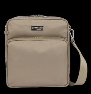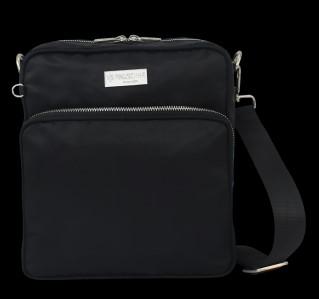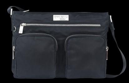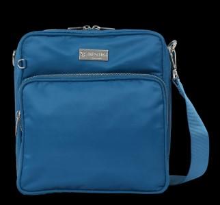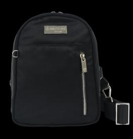 Top zip entry to the man compartment. Inside has one zip pocket and one open pocket and two multipurpose pockets. Outside front and rear have zip pockets. Adjustable strap with max 26” drop. (14” x 7.5” x 3.5”).