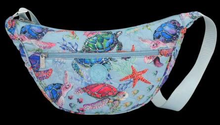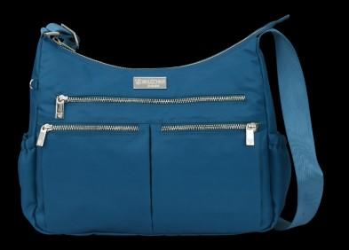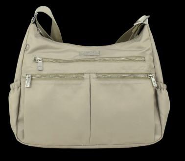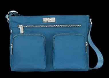 Zippered entry to the main compartment. One zippered wall pocket. Two multipurpose pockets. Outside front has full length one zippered wall pocket. Two zippered pocket with gusset. Rear one zippered wall pocket. Bottle holder on both sides. Cross body strap with full adjustable maximum drop of 26”. (13.5” x 10” x 5” .).