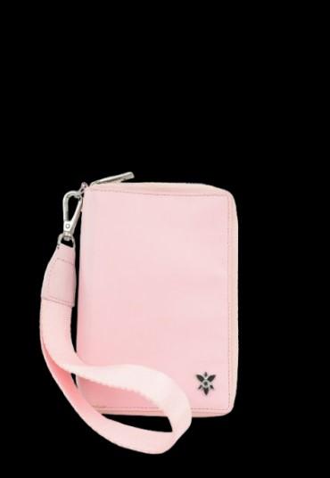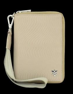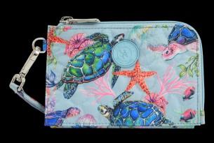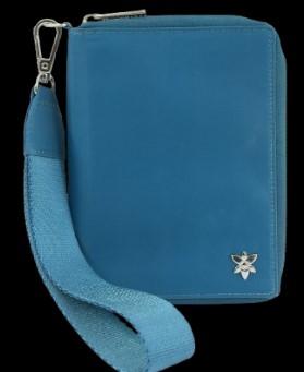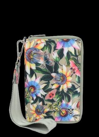 All-round zippered entry. Inside one full length open bill pocket. Four RFID-protected card holders with one ID window. One zippered pocket. Two slip in multipurpose pockets. One transparent passport holder. Rear one zippered pocket. Wristlet with 6" drop.(4.75” X 6.5‘).