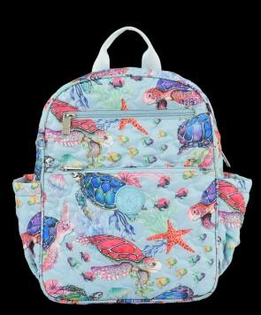 Top zip entry to the main compartment. Inside one zipper pocket, one open wall pocket and two multipurpose pockets. Outside front has two zip compartment and rear has a vertical zip pocket. Adjustable strap for backpack with max 18" drop. (9"x 12" x 5").