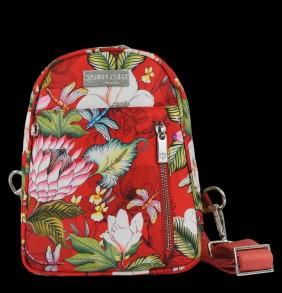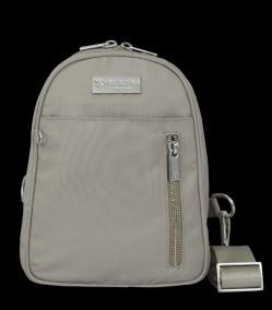 All-round zip entry to the main compartment. Inside one open pocket, one zip pocket and two multipurpose pockets. Front has two zip pockets, five cc slots with RFID protection. Rear has a zip pocket. Adjustable backpack strap with max 18” drop. (9.5” x 12” x 4.5”).