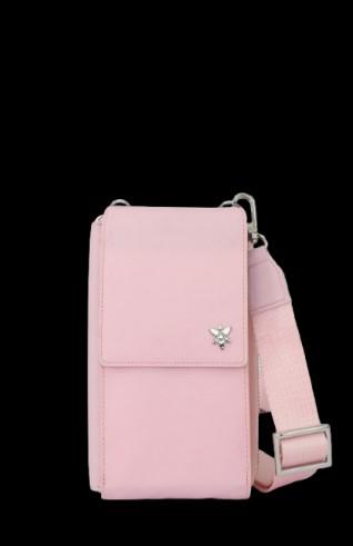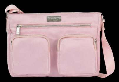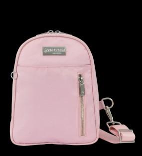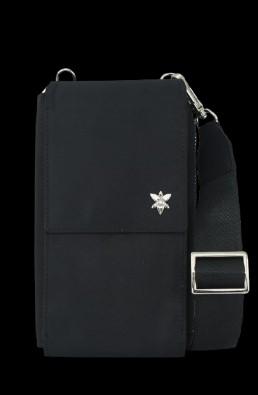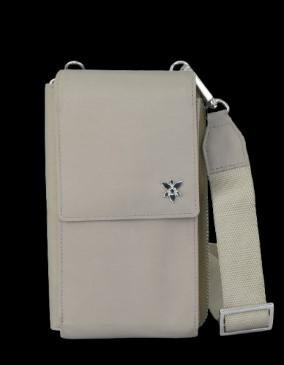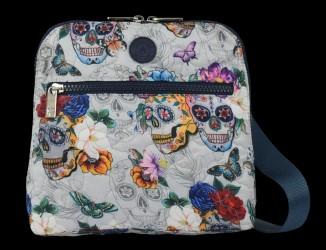 All-round zip entry to the main compartment. Inside one central zippered partition pocket, one zippered wall pocket and one cell pocket. Outside front and rear have zipper pockets. Adjustable cross-body strap with max 26” drop. (9” x 8” x 2.5”).