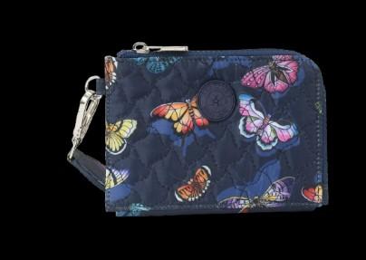 Two zip poxket with gesset. 5 RFID protected card holders and 1 ID window. Removable wristlet with 6" drop. (5.75" x 3.75").