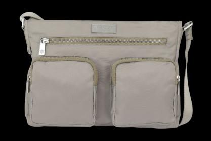 Top zip entry to the main compartment. Inside one open wall pocket, one zippered wall pocket and two multipurpose pockets. Front zippered pocket. Two zippered vertical pockets.. Adjustable cross-body strap with max 26” drop. (13” x 10.5 x 4.5”).