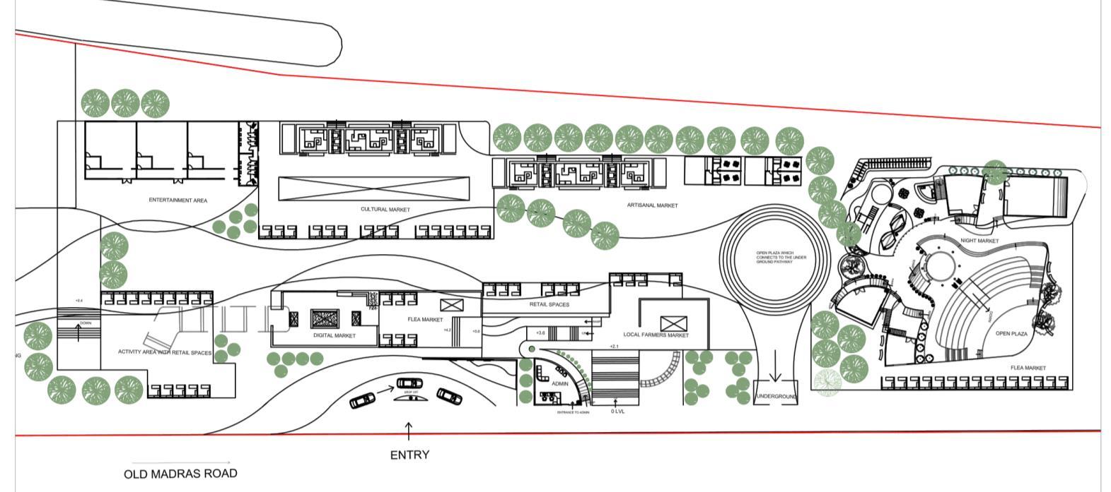 The urban design of the Baiyappanahalli market in Bengaluru seamlessly merges modern and traditional elements to create a vibrant and functional space. Emphasizing pedestrian-friendly zones, green spaces, and cultural context, the project showcases the importance of context-sensitive and sustainable design in urban settings.
