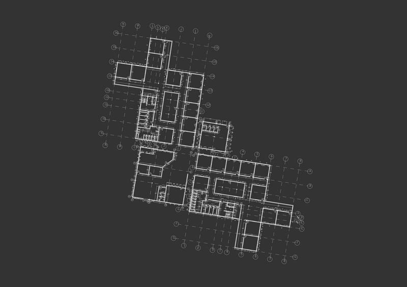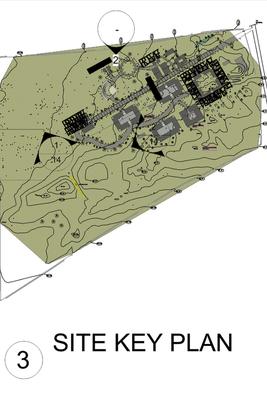The site is divided nto two halves – on the upper half of the site a l the working blocks and spaces are arranged in a hierarchy of spaces of use adm n conference and workshops with supporting staff, breakout pavil ons and oat On the lower half a l the residential and persona spaces are arranged fo lowing the hierarchy of use of spaces i e cottages of personal residences for the long staying professiona s and hostels for the professionals and guests coming dur ng the t me of retreat the ibrary s sandwiched between the two so that it could be accessib e by the peop e of both the b ocks of hoste as well as the residences