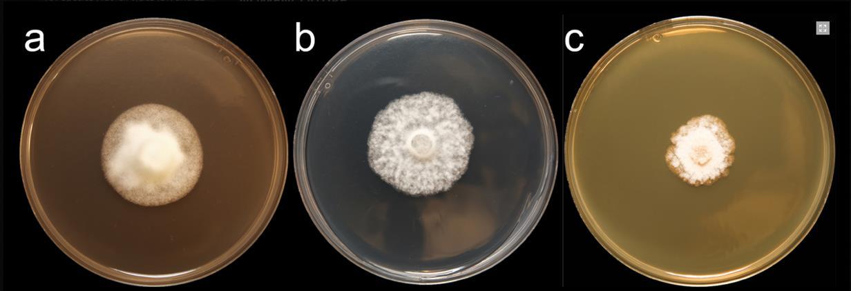 Colonie di Phytophthora ramorum coltivate per 7 giorni su (a) V8® Agar, (b) potato dextrose agar e (c) malt extract agar