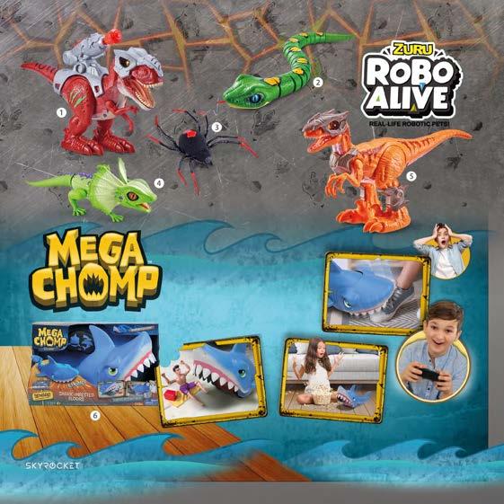 45 INTERAKTĪVĀS ROTAĻLIETAS Vairāk produktu pieejami XS Rotaļlietas veikalos un e-veikalā www.xsrotallietas.lv 1.1 7132 ZURU Roboalive Interaktīvā rotaļlieta - T-Rex 2.1 7150 ZURU Roboalive interaktīvā rotaļlieta Čūska, 40 cm 3.1 7151 ZURU Roboalive Interaktīvā rotaļlieta - Zirneklis 4.1 7149 ZURU Roboalive interaktīvā rotaļlieta - Ķirzaka, 40 cm 5.1 7133 ZURU Roboalive Interaktīvā rotaļlieta - plēsējs 6.1 18493S MEGA CHOMP Radiovadāmā haizivs Uzmanies no Mega Chomp! Tas ir viltīgs, kluss un īpaši izsalcis!!! Uz grīdas vairs nevienam nav droši! Izmanto pulti, lai vadītu šo haizivi! Tas ir ātrs un izskatās kā īsts! Pamēģini to noķert! Robo Alive dzīvnieki izskatās un kustās, kā īsti dzīvnieki! Tiem nepieciešamas baterijas.