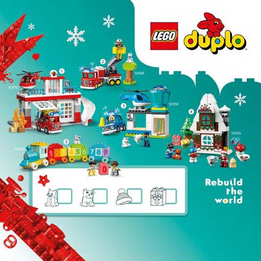 63 KONSTRUKTORI Vairāk produktu pieejami XS Rotaļlietas veikalos un e-veikalā www.xsrotallietas.lv Skaitīsim kopā? Cik dzīvniekus, cepures un dāvanas vari atrast šajā lapaspusē? 1.1 10970L LEGO DUPLO Ugunsdzēsēju depo un helikopters 2.1 10969L LEGO DUPLO Ugunsdzēsēju auto 3.1 10959L LEGO DUPLO Policijas iecirknis un helikopters 4.1 10976L LEGO Duplo Ziemassvētku vecīša piparkūku namiņš 5.1 10954L LEGO DUPLO Ciparu vilciens — mācies skaitīt