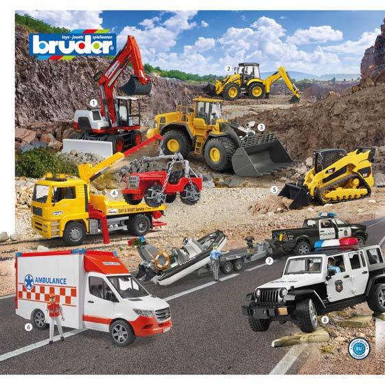 56 Daugiau prekių rasite parduotuvėse „XS Žaislai“ ir www.xszaislai.lt AUTOMOBILIAI IR VEIKSMAS 1.1 3411K BRUDER Ekskavatorius 2.1 2454 BRUDER Traktorius JCB 5CX 3.1 02458 BRUDER Ratinis krautuvas VOLVO L260H 4.1 2750 BRUDER Sunkvežimis MAN TGA su kranu ir raudonu džipu 5.1 2136 BRUDER Mini krautuvas CAT 6.1 02676 BRUDER Greitosios pagalbos automobilis MB SPRINTER 7.1 02507 BRUDER Policijos automobilis DODGE RAM su 2 figūrėlėmis, priekaba ir valtimi 8.1 2526 BRUDER Policijos automobilis JEEP WRANGLER su policininku Kiekvieno mažojo statybininko svajonė! „Bruder“ transporto priemonės pasiruošusios padirbėti iš peties! Nutikobėda?Greitosios pagalbosautomobilis jauskubapadėti!