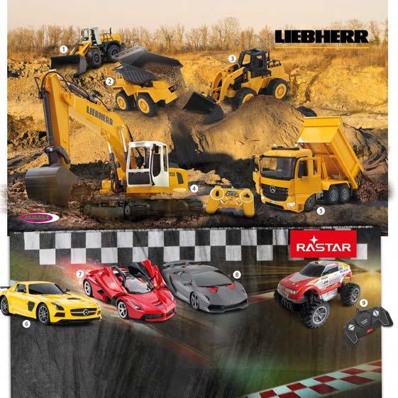 57 AUTOMOBILIAI IR VEIKSMAS Daugiau prekių rasite parduotuvėse „XS Žaislai“ ir www.xszaislai.lt 1.1 405007 LIEBHERR 1:20 RC Ratinis krautuvas LIEBHERR 564, 2,4 GHz 2.1 410151 1:36 RC Sunkvežimis MK136, 2,4 GHz 3.1 410150 1:36 RC Ratinis krautuvas RL136, 2,4 GHz 4.1 405060 LIEBHERR 1:20 RC Ekskavatorius LIEBHERR R936, 2,4 GHz 5.1 404940 MERCEDES-BENZ 1:20 RC Sunkvežimis MB AROCS, 2,4 GHz 6.1 4254100 RASTAR RC automobilis MERCEDES-BENZ SLS AMG 1:18 7.1 4250100 RASTAR RC automobilis LA FERRARI 1:14 8.1 4253700 RASTAR RC automobilis LAMBORGHINI SESTO ELEMENTO 1:18 9.1 42P0618 RASTAR RC automobilis MITSUBISHI PAJERO EVO DAKAR, 1:18 Šie elegantiški radijo bangomis valdomi automobiliai gali važiuoti pirmyn, atgal, sukti į kairę ir į dešinę. Ekskavatorius„Liebherr“sutikroviškomis ekskavatoriusfunkcijomis!Radijobangomisvaldomasturididelįkaušą,griovimorutulį, plaktuką,tikroviškusvarikliogarsus,įspėjamąjį atbulinėseigossignaląirLEDšviesas.