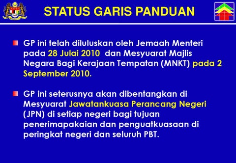 STATUS GARIS PANDUAN GP ini telah diluluskan oleh Jemaah Menteri pada 28 Julai 2010 dan Mesyuarat Majlis Negara Bagi Kerajaan Tempatan (MNKT) pada 2 September 2010. GP ini seterusnya akan dibentangkan di Mesyuarat Jawatankuasa Perancang Negeri (JPN) di setiap negeri bagi tujuan penerimapakaian dan penguatkuasaan di peringkat negeri dan seluruh PBT.