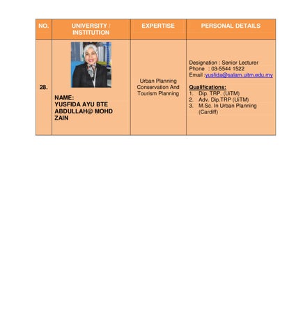 Qualifications: 1. Dip. TRP. (UiTM) 2. Adv. Dip.TRP (UiTM) 3. M.Sc. In Urban Planning (Cardiff)