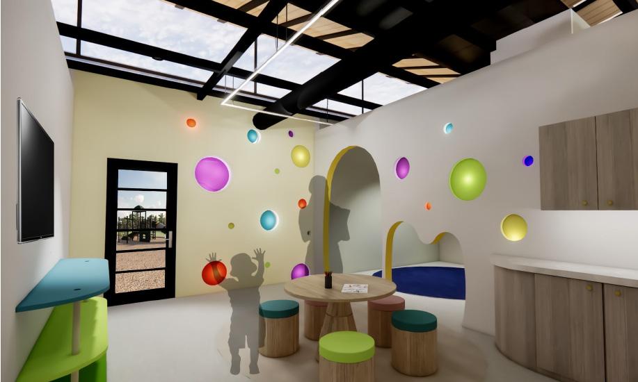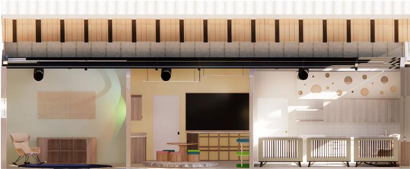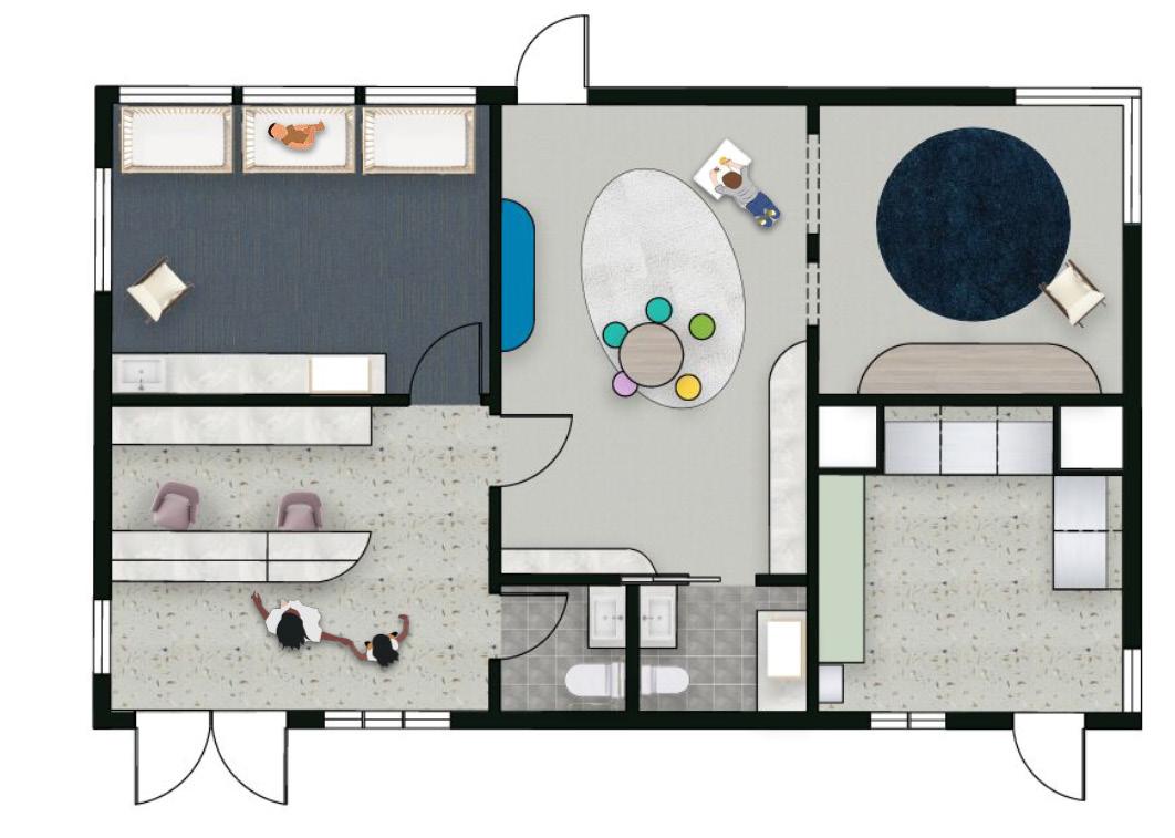 The community spaces I designed included the salon and the daycare center/laundry facilities. To the right is a rendered floorplan of the daycare/ laundry facility with a public restroom. Below is an elevation that shows the quiet room, playroom and nursery.