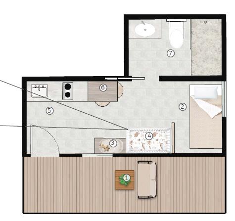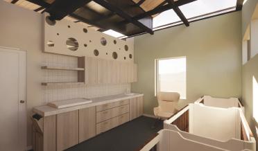 The floorplan I designed was for a single mother and their child. To create a sense of home, the kitchen is the first thing you see when you walk in . The crib provided is a 3-in-1 convertible crib that is perfect for an infant all the way up to a toddler, paired with a changing table/dresser providing single bed with a crib