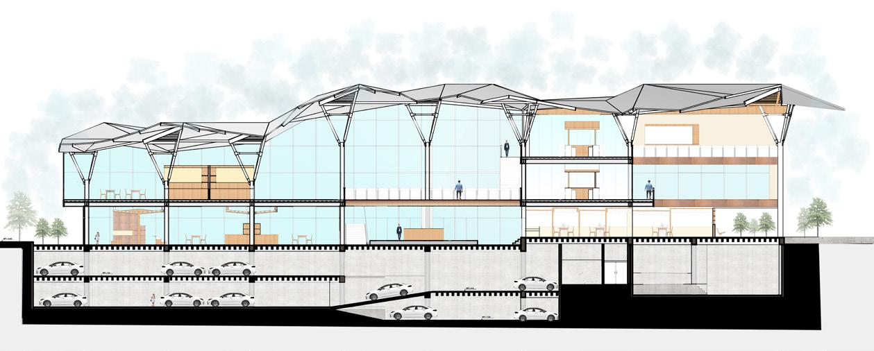 El concepto surgio del entorno frente al que se ubica, el mar, la presencia de las olas , el sentido en el que va y el movimiento que lo conforman genera la forma de la cobertura del proyecto. Asimismo, se tomo las pendientes, bajadas del acantilado y de ambas avenidas que te dirigen visualmente hacia el Mercado Gourmet.
