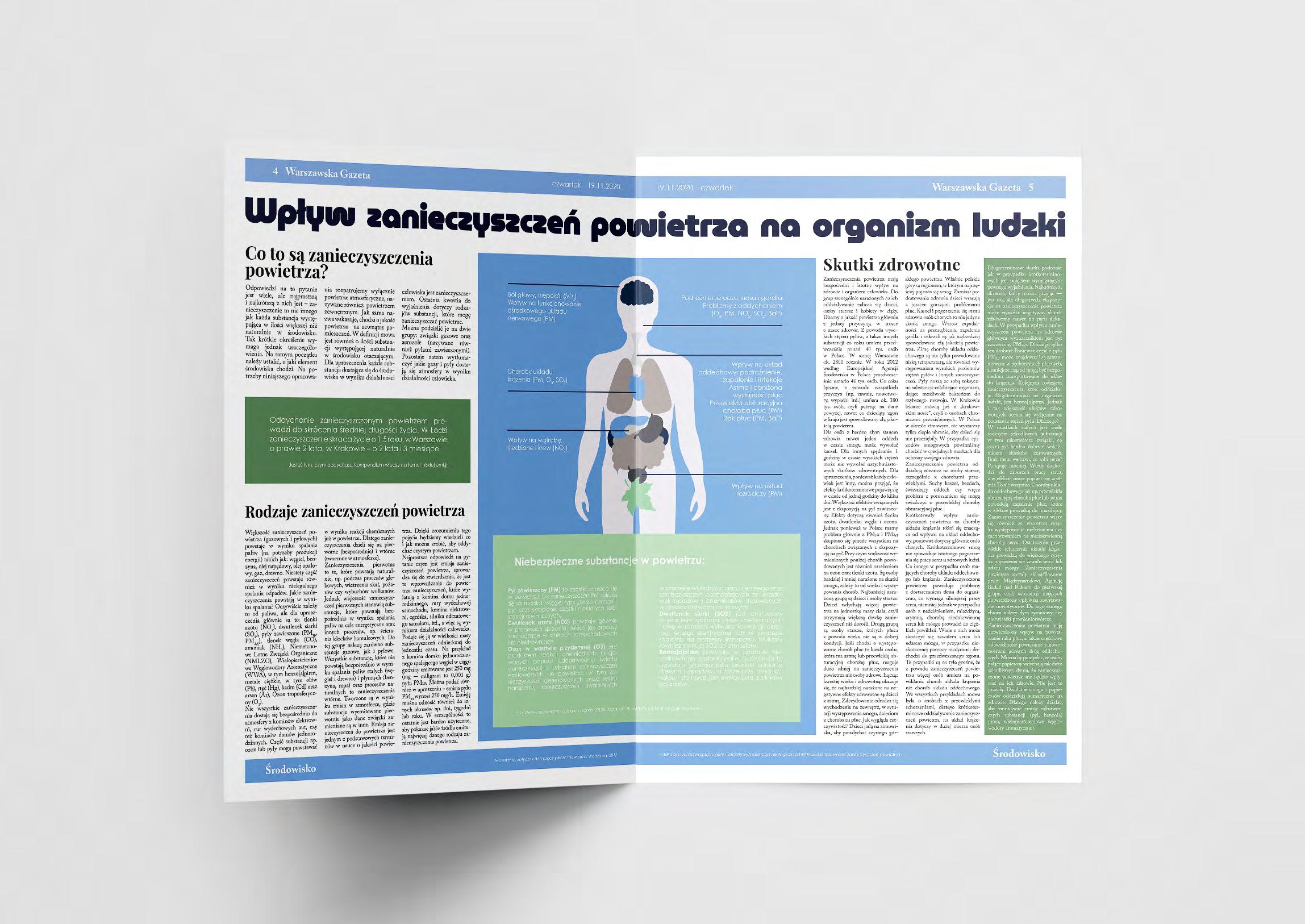 розвороту щоденної газети, що розповідає про вплив забруднення повітря на організм людини, його вплив на здоров’я та статистику людей, які страждають від твердих частинок, смогу та інших забруднюючих речовин у Польщі.