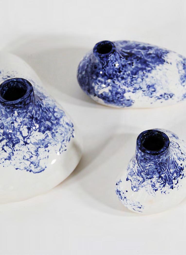2019 набір ваз Унікальний керамічний набір з трьох абстрактних форм виготовлених вручну. Проект натхненний органічними формами. Разом форми складають цілісну композицію, але кожен з елементів може також функціонувати, як соло. Початкові моделі були виготовлені з різьбленої глини, на їх основі створювались гіпсові форми, які згодом заповнювали наливною глиною. Кінцевий набір виготовлений з полімерної глини покритої "поливою, чи глазур'ю". Набір виконує декоративну функцію.