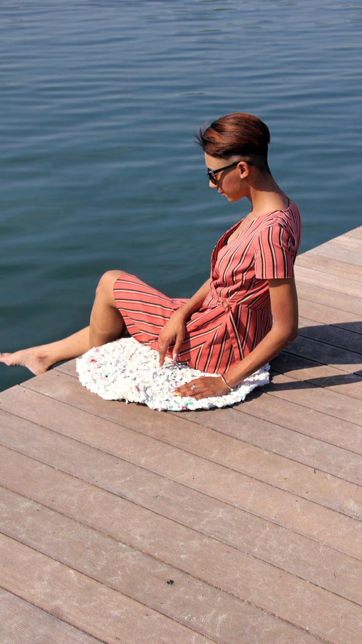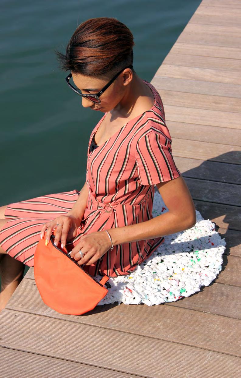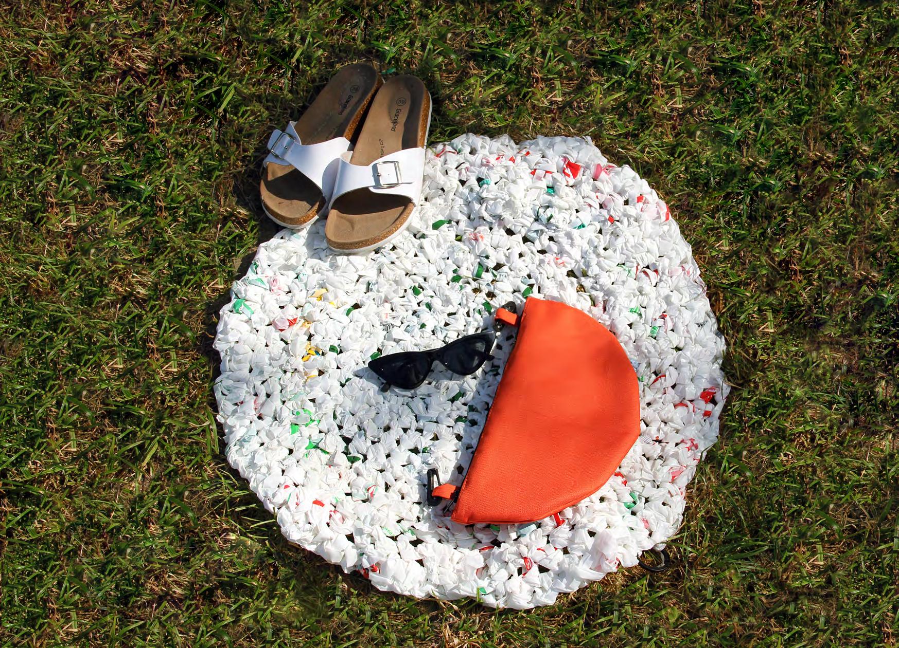 Пляжний килимок є натхненний принципами безвідходної продукції Zero Waste. Проект був виконаний технікою recykling, а саме — в’язання гачком з поліетиленових пакетів, нарізаних на смужки шириною 5 см. Плетіння з поліетиленових "ниток" створює м’який і різнокольоровий матеріал з ажурними отворами. Колір "пряжі" залежить від фантазії дизайнера, уподобань користувача або кольорів доступних на пакеті. Сумка-килим має функцію регуляції плечиків, роблячи можливим адаптації проекту до потреб кожного користувача. Додаткова сумочка для аксесуарів підібрана до килимка та сидіння для особистих речей, виготовлена з водонепроникної кордури. Килимок-сидіння легкі і тримаються по воді, що дає інші можливості їх використання. спільний проект