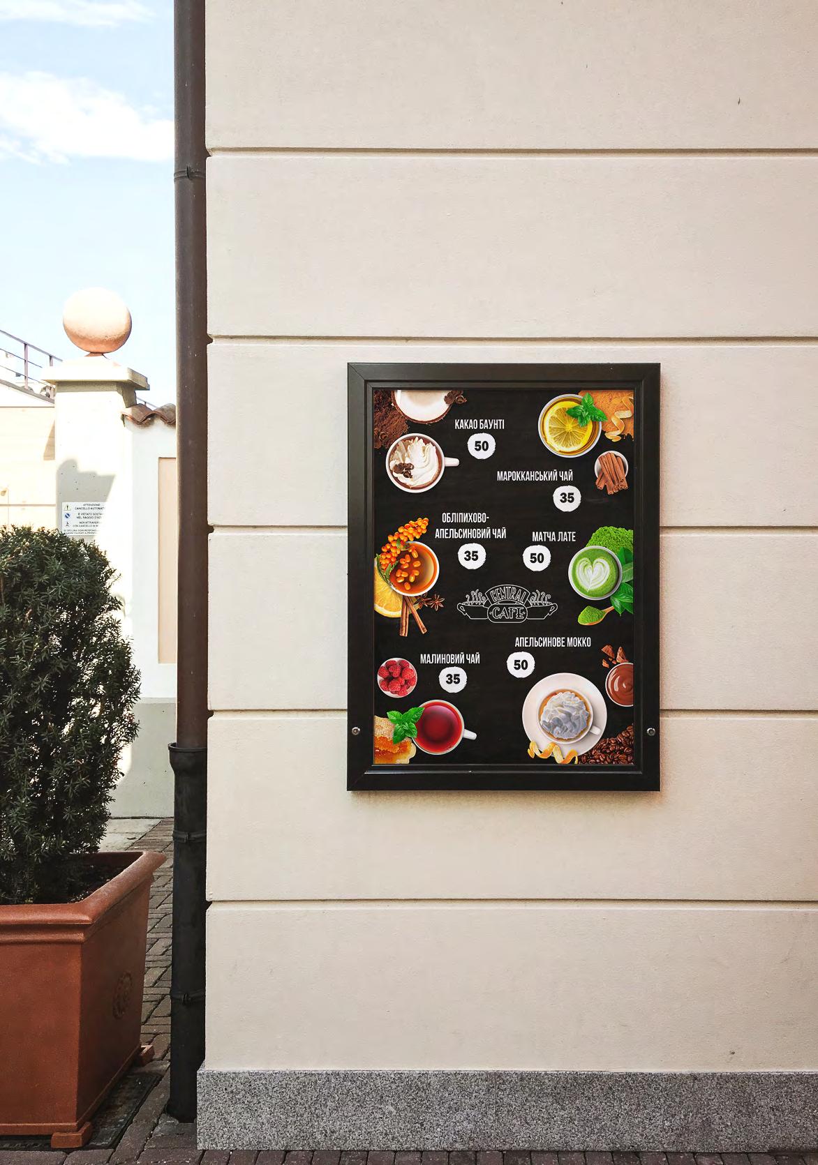 2021 меню Дизайн меню для Central Cafe із представленням актуальних напоїв, їх видів, цін та ілюстрацій.