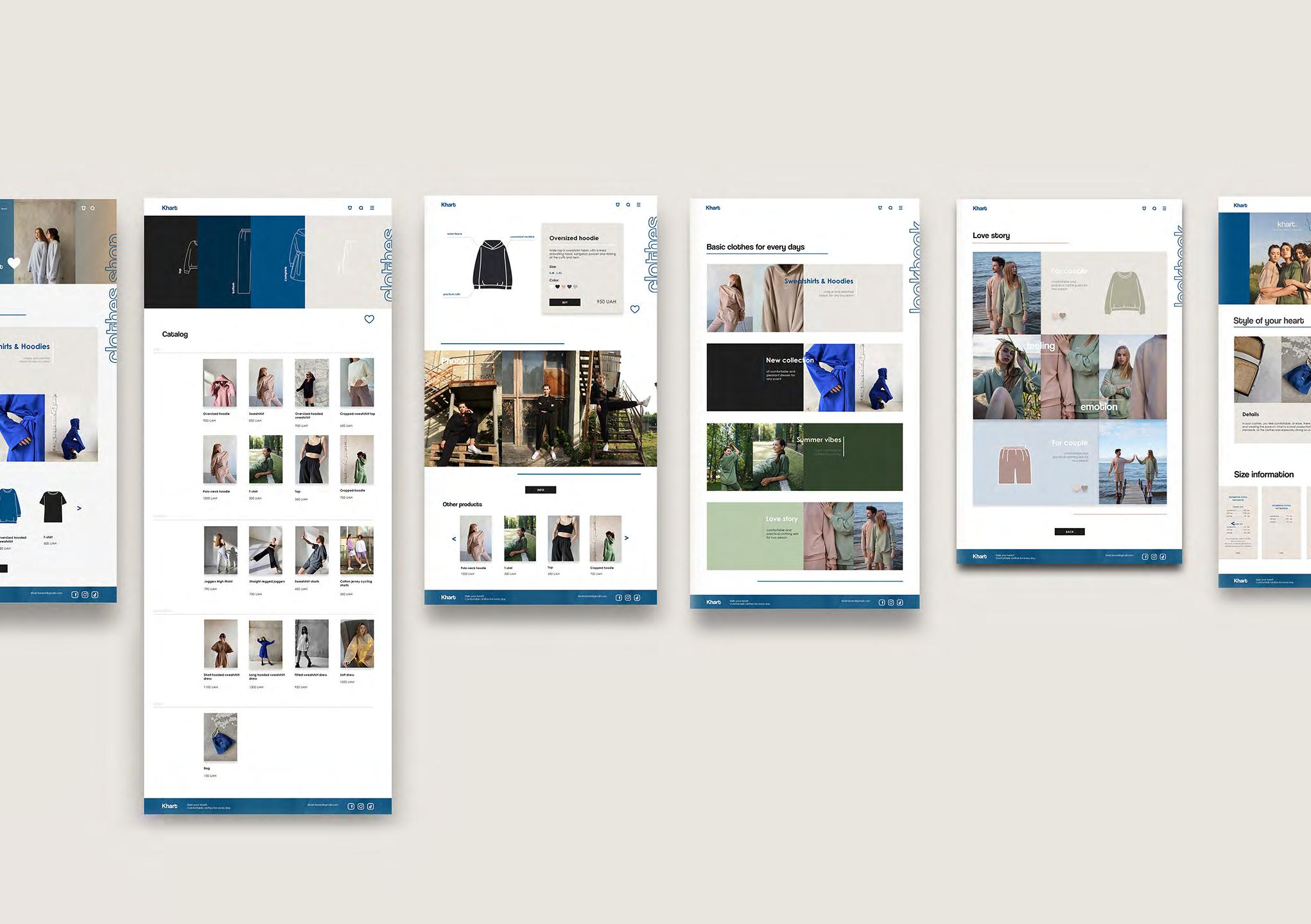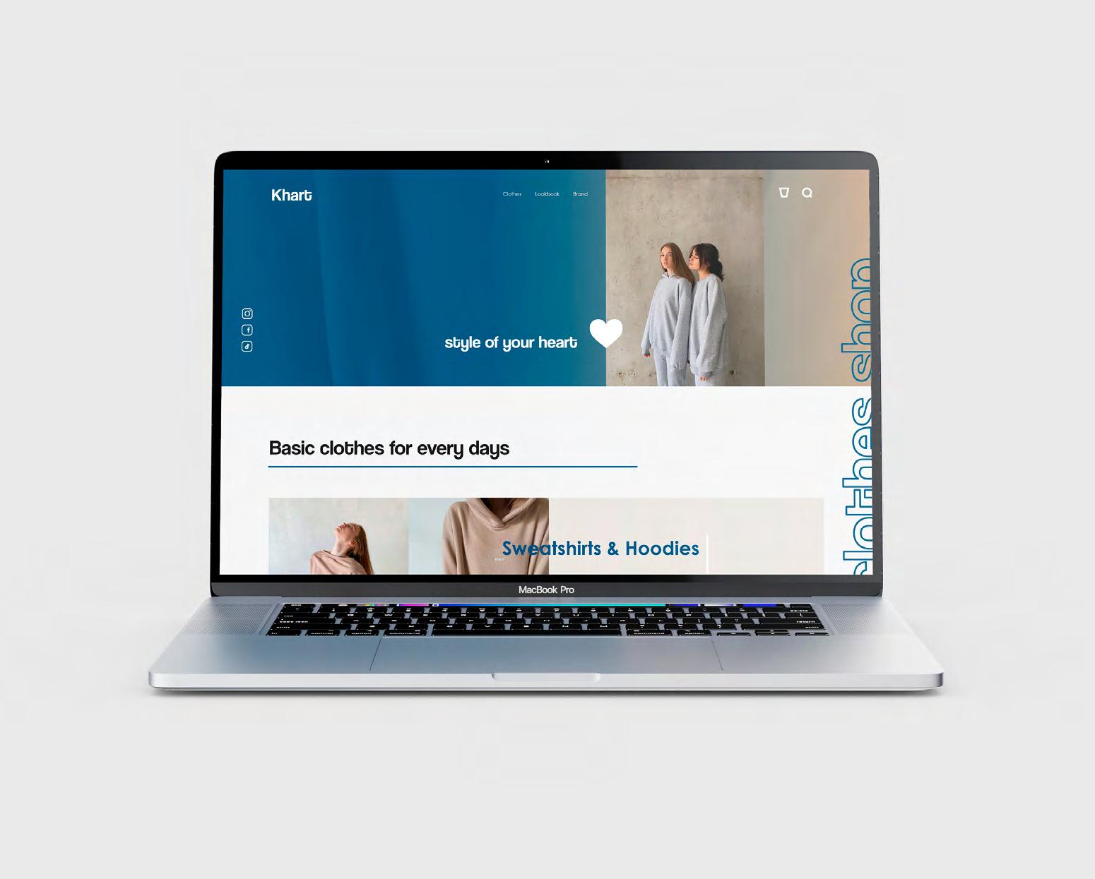 макет веб-сторінку магазину Проєкт інтерфейсу веб-сторінки для продажу та реклами виробів одягу, представлення їх асортименту магазину для молодого українського бренду Khart. Цільова аудиторія скерована на жінок у віці від 16 до 30 років, які ведуть активний спосіб життя, щодня піклуються про свою зовнішність та стежать за модними тенденціями. Товар орієнтований на покупців, які віддають перевагу модному та зручному одягу. Зміст та основні функції веб-сайту бренду khart — це маркетинг та комунікація візуальна, стратегічна та допоміжна функції, інформаційна та презентаційна функції, обслуговування та актуалізація замовлення та персоналізація товару. Сайт має помірну кольорову палітру, з сучасним єдиним стилем. Модель сторінки