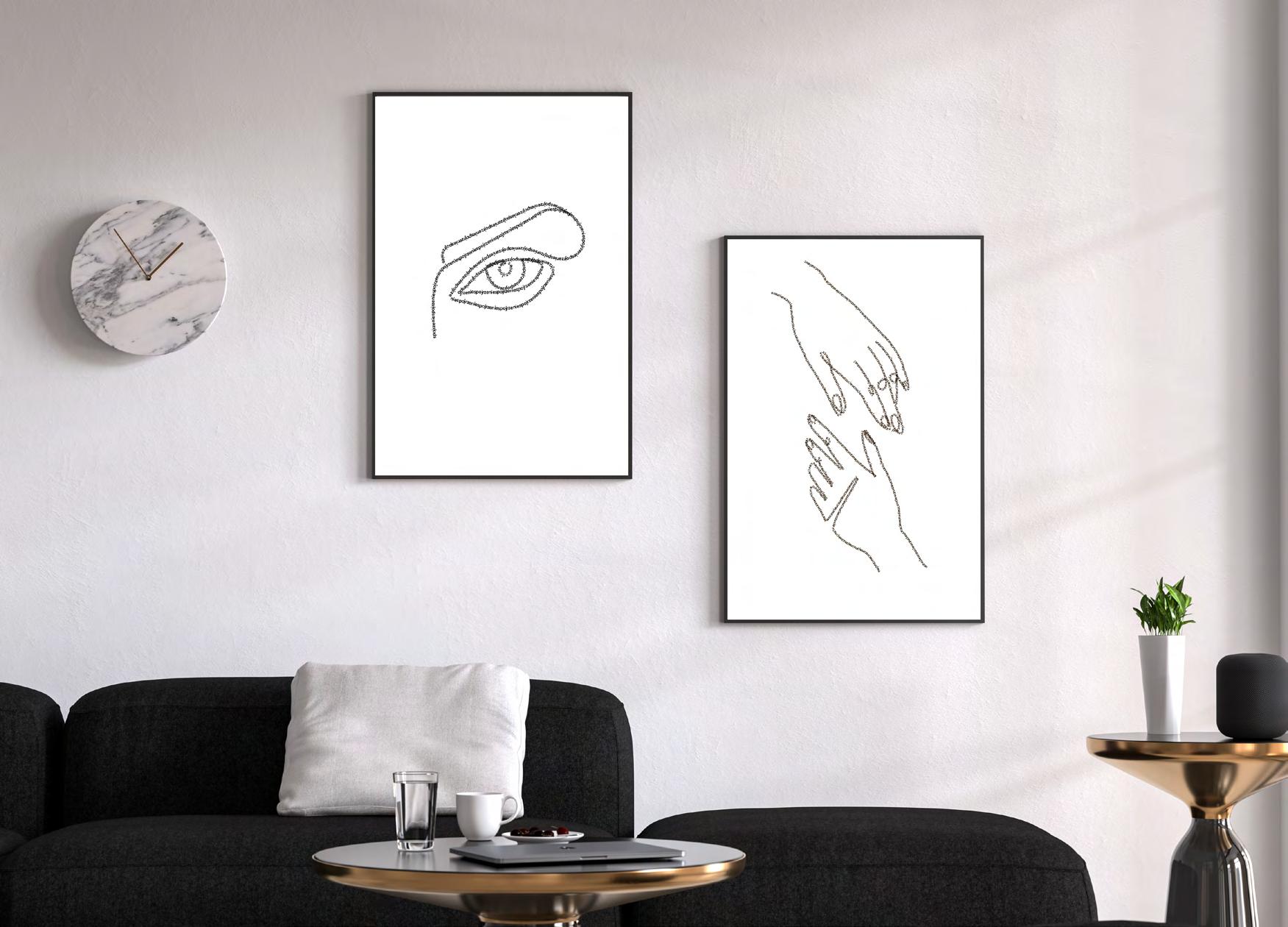 Серія плакатів, що ілюструють три значення, намальовані один рядок-рядок слів: Любов, Дотик і Погляд.
