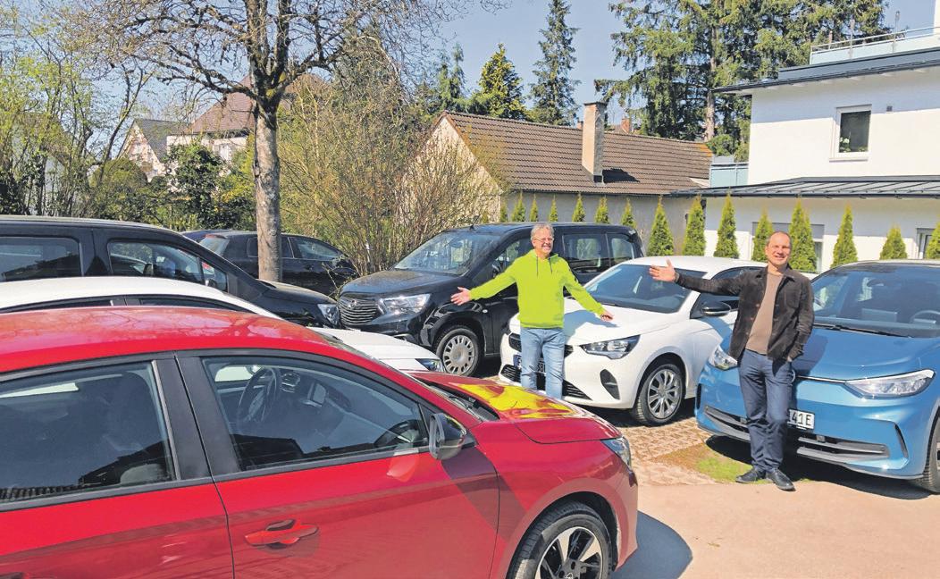OB Christian Götz (re.) freut sich zusammen mit Mitarbeiter Jürgen Müller (li.) über die E-Auto-Flotte. Foto: Stadt FFB