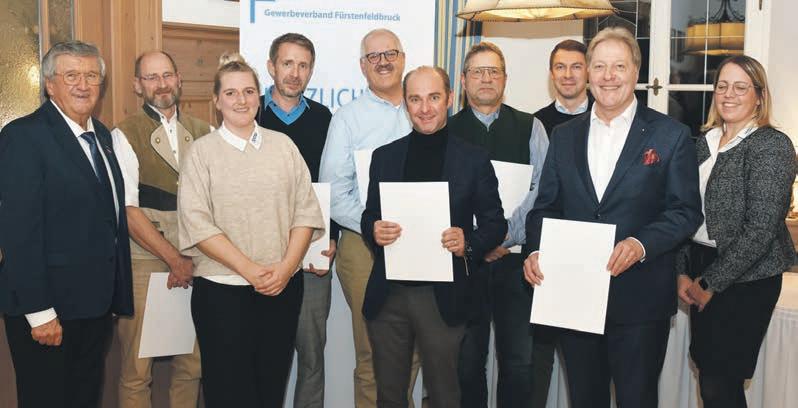 Geehrt mit einer Urkunde und einem Karton Wein wurden: Klaus Hörhager von Anima Event GmbH (15 Jahre), Alexander Lutz vom Autohaus Lutz (25 Jahre), Klaus Pleil von Schuh-Orthopädie (35 Jahre), Bernhard Förg von Reifen Haja, Claus Klotz vom AEZ, Dominik Hammerand vom Amper-Kurier (alle 45 Jahre), die Volksbank und Raiffeisenbank, Max Wimmer von der Bäckerei Wimmer (beide 60 Jahre), Albert Bosch von Tabak-Bosch, die Sparkasse FFB, Erich Spörer vom Fuhrunternehmen Spörer, Franz Weigl von Elektro-Weigl (alle 65 Jahre), Dieter Metzler