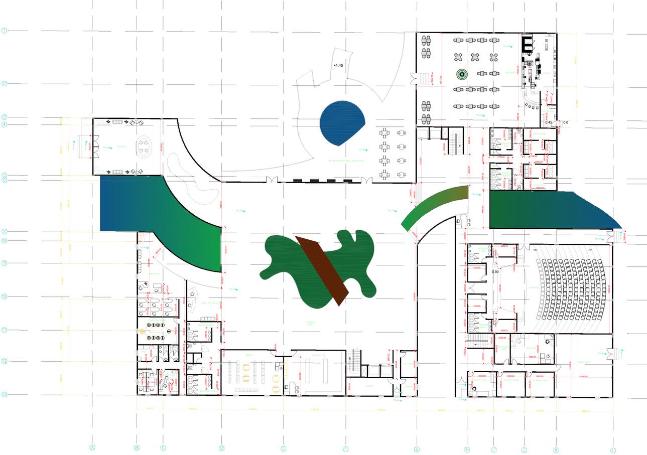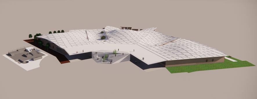 Parametricroofwhich coverstheenitre structurewithadropin theoutdoorareas.