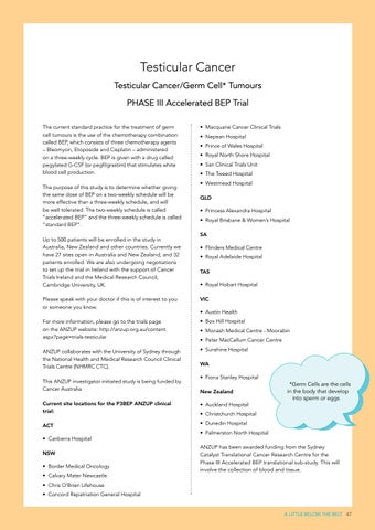 Testicular Cancer Testicular Cancer/Germ Cell* Tumours PHASE III Accelerated BEP Trial The current standard practice for the treatment of germ cell tumours is the use of the chemotherapy combination called BEP, which consists of three chemotherapy agents – Bleomycin, Etoposide and Cisplatin – administered on a three-weekly cycle. BEP is given with a drug called pegylated G-CSF (or pegfilgrastim) that stimulates white blood cell production. The purpose of this study is to determine whether giving the same dose of BEP on a two-weekly schedule will be more effective than a three-weekly schedule, and will be well tolerated. The two-weekly schedule is called “accelerated BEP” and the three-weekly schedule is called “standard BEP”. Up to 500 patients will be enrolled in the study in Australia, New Zealand and other countries. Currently we have 27 sites open in Australia and New Zealand, and 32 patients enrolled. We are also undergoing negotiations to set up the trial in Ireland with the support of Cancer Trials Ireland and the Medical Research Council, Cambridge University, UK.