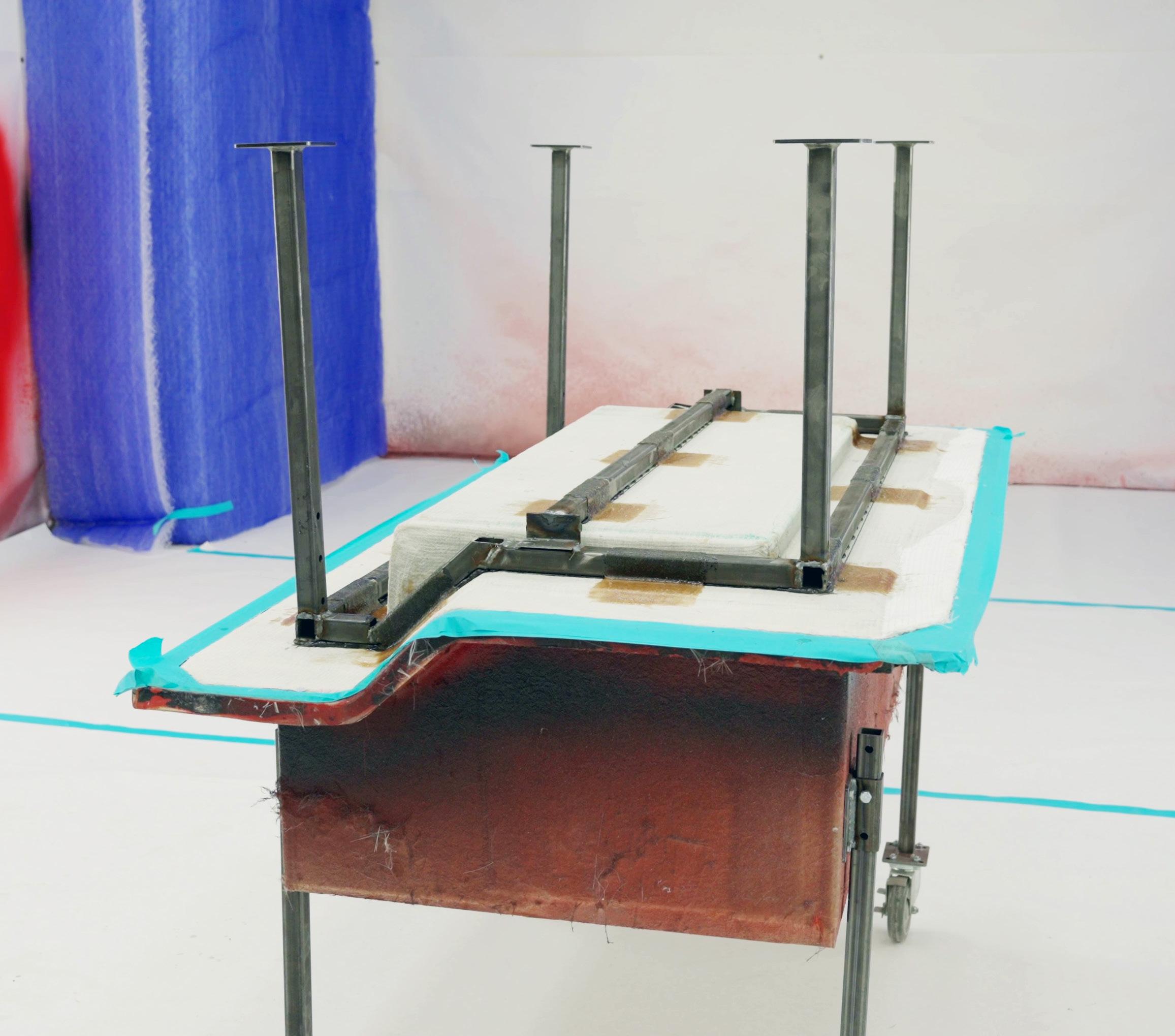 The next step is to apply a frame to the backside of the tool. To reduce torsion during the demolding process, we recommend applying a steel frame around the tool. Secure the frame at multiple points using adhesive and laminate for stability.