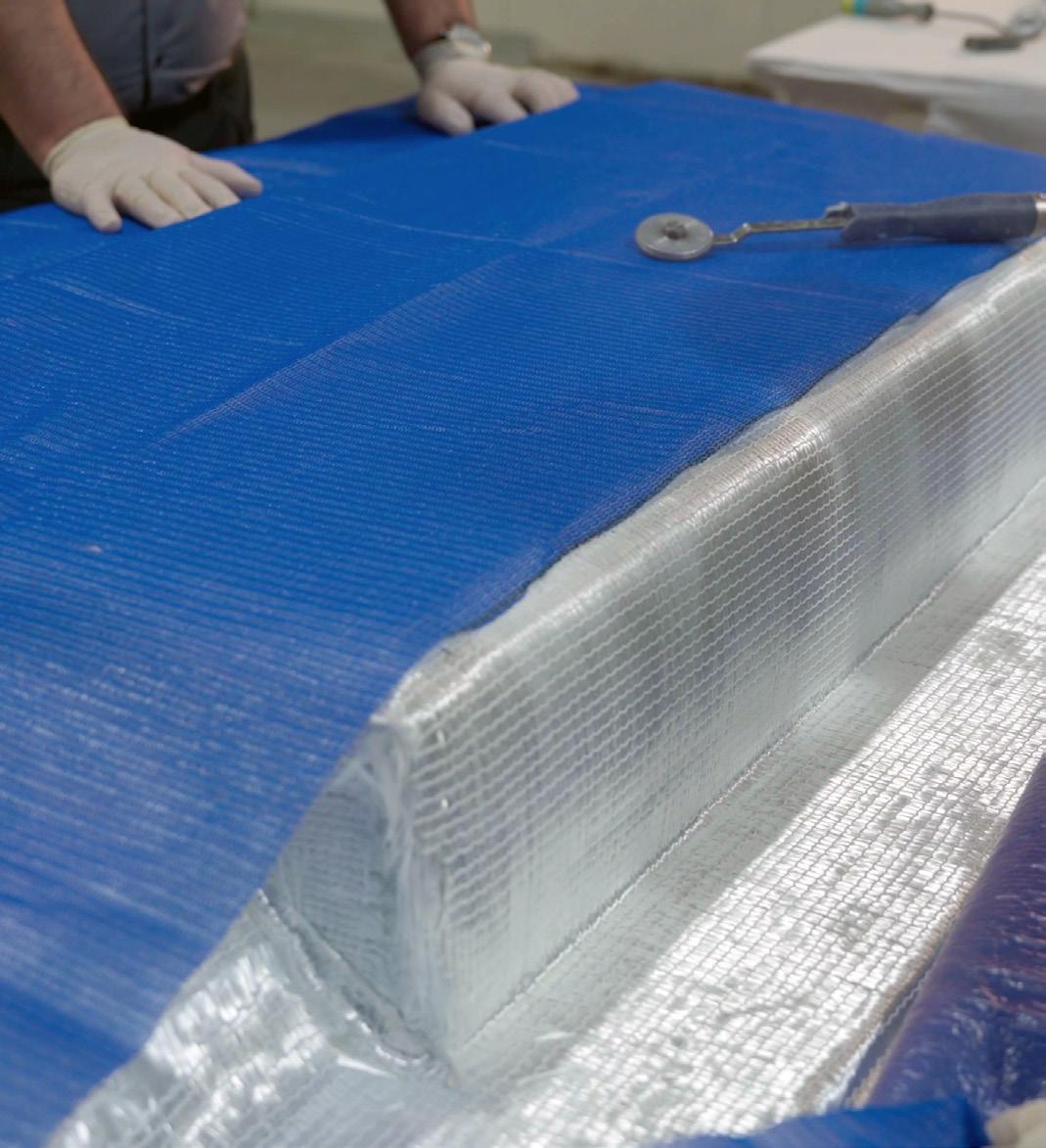 Put down the peel ply, followed by the flow media, covering the surface of the master model. The flow media ensures consistent wetting of the glass and an even cure. Then, locate the resin and vacuum feed lines. The format of these consumables will vary depending on the size and shape of the tool and infusion strategy setup.