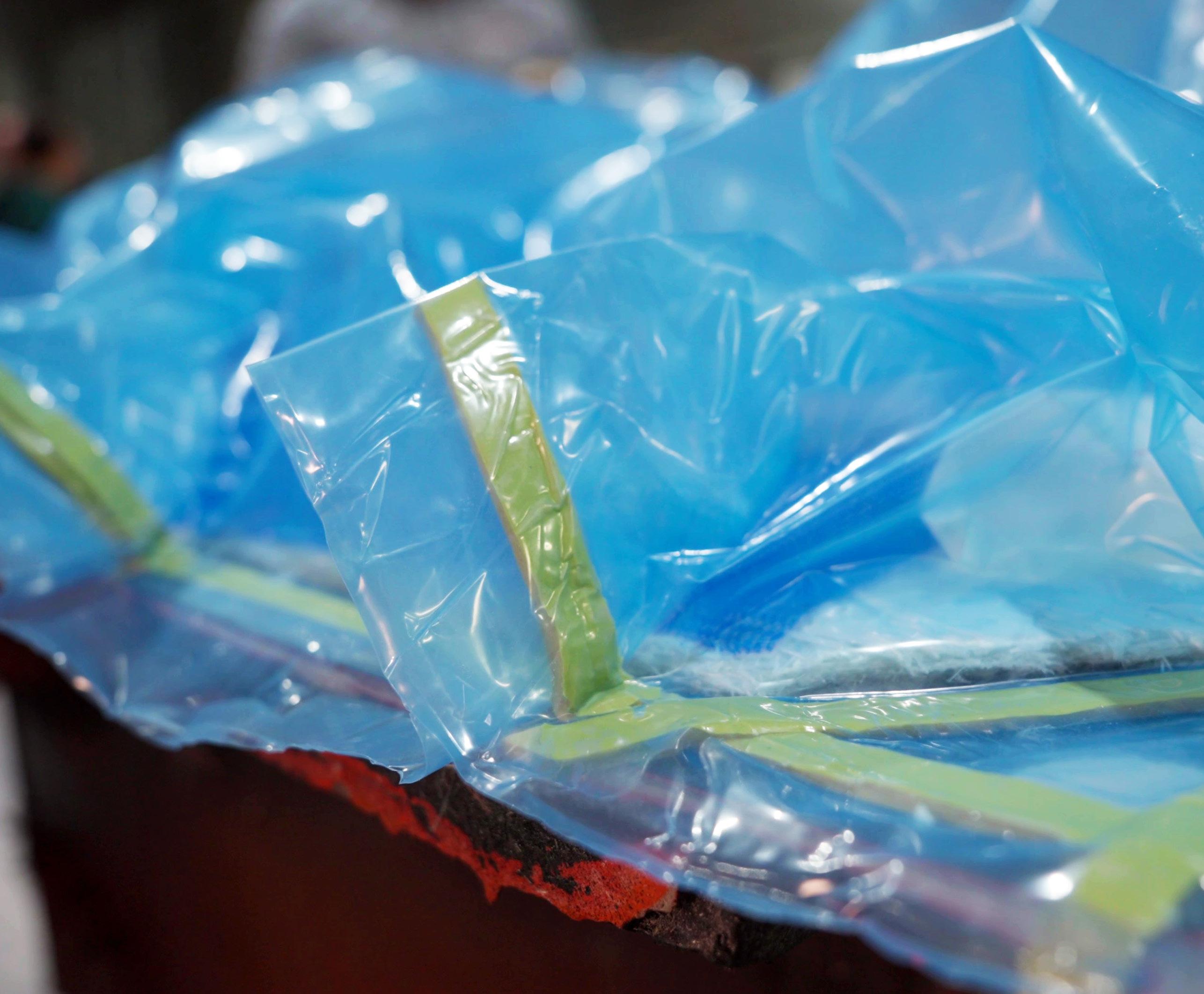 Next, set up the bagging system. Keep in mind that the bagging material should be three times the amount of material needed for the developed area of the final tool. This should be done by creating pleats, to allow the vacuum to pull the material tight and conform to the master model’s contour.