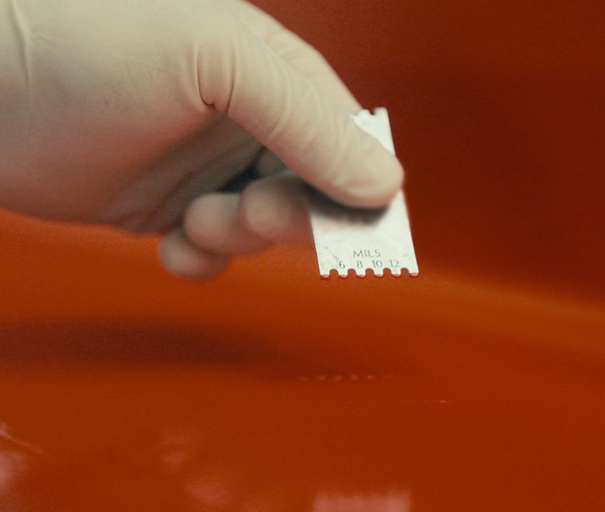 Apply the first layer of gel coat at 20 mils wet. Inspect for full cure before applying the second gelcoat layer. Once the first layer is cured, you’ll then apply a second layer of a different color gel coat, or alternatively, a barrier coat if extra protection is needed for the tool. Ensure the second layer is also applied at 20 mils wet.