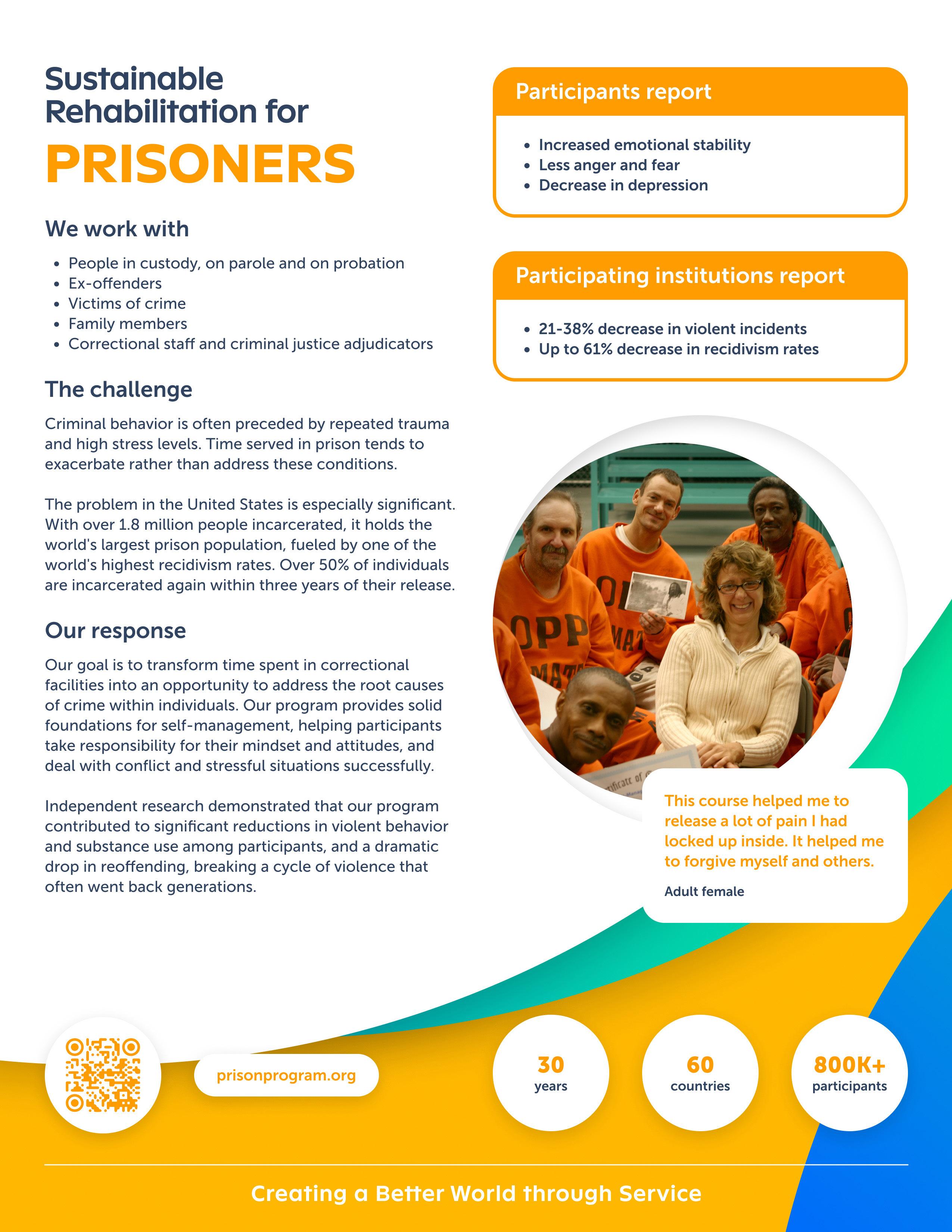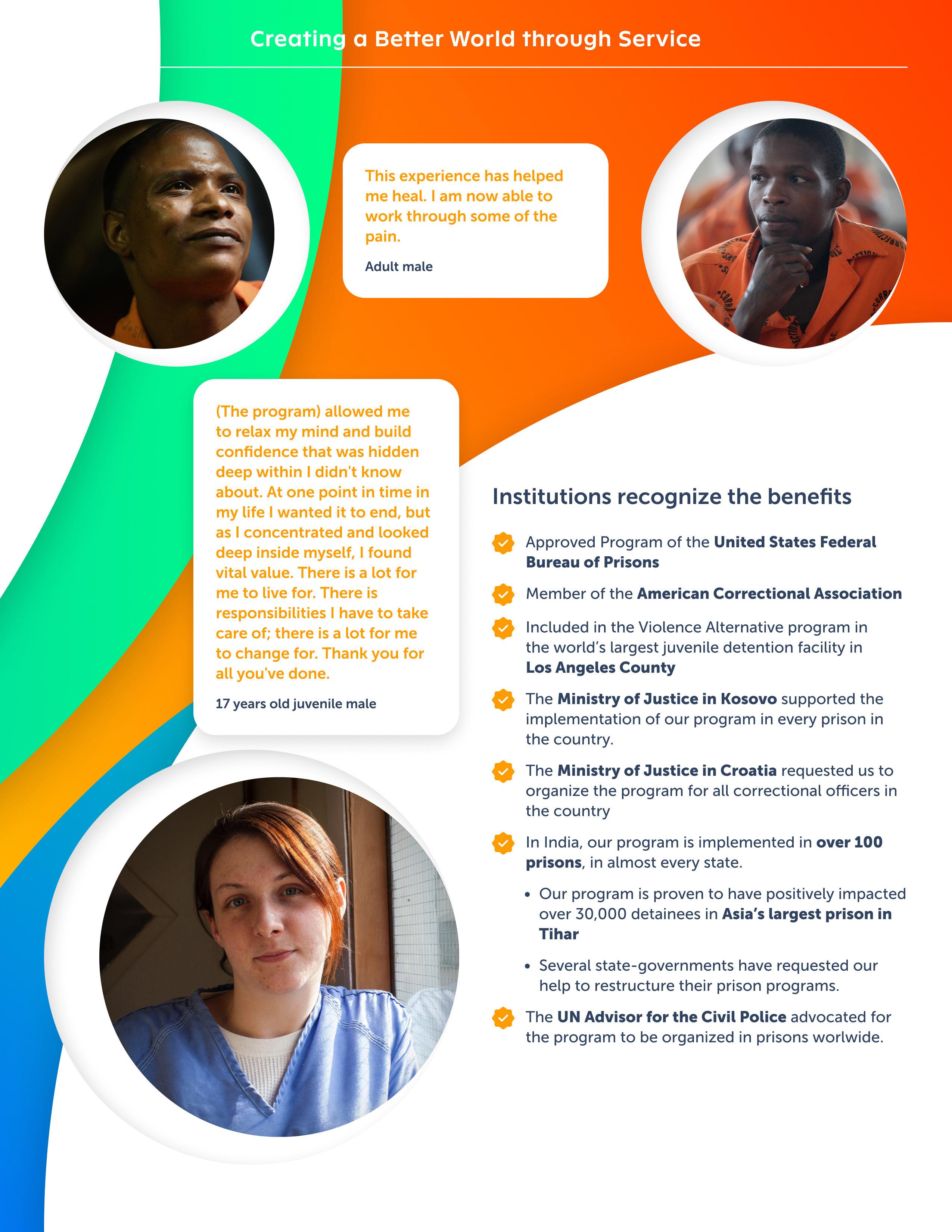 The Art of Living works in partnership with the International Association for Human Values (IAHV) in offering tailored mental wellness and resilience programs for veterans, healthcare workers, police officers, students, prison inmates, teachers, at-risk youth, and more.