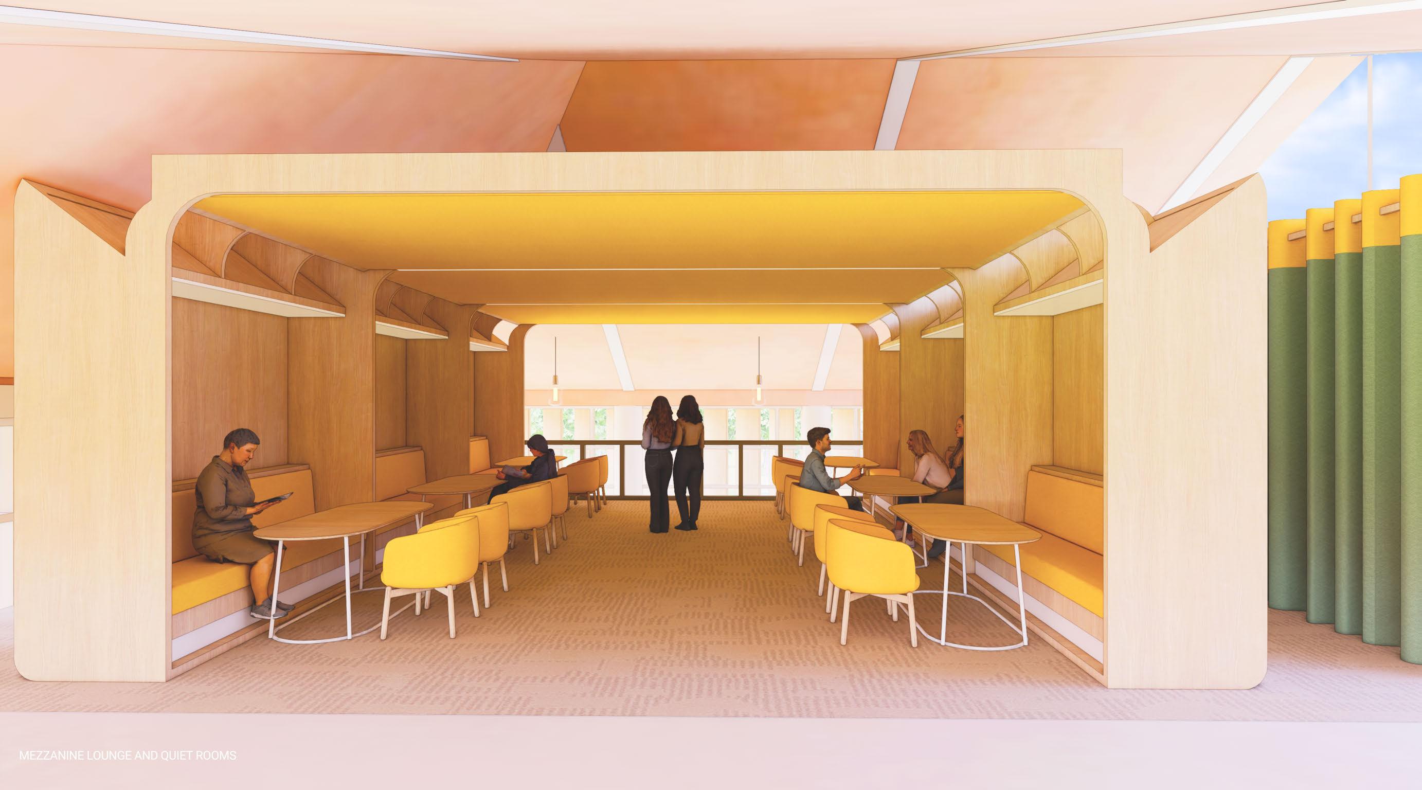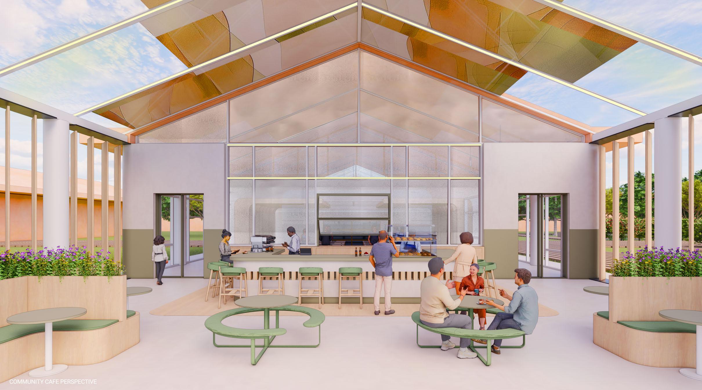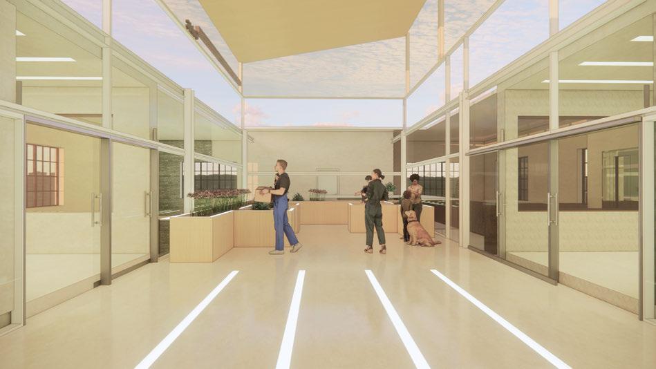 THE ATRIUM IS A TRANQUIL OASIS, THOUGHTFULLY DESIGNED TO FOSTER A DEEP CONNECTION TO NATURE AND PROMOTE WELLBEING, WHILE OFFERING A SENSE OF INDEPENDENCE AND PERSONAL SPACE. AT ITS HEART IS A SERENE REFLECTIVE POOL, WHERE STILL WATERS MIRROR THE SURROUNDING ARCHITECTURE AND NATURAL LIGHT, CREATING A CALMING, MEDITATIVE EFFECT. SURROUNDED BY TREES AND LUSH SHRUBBERY, THE SPACE BRINGS NATURE INDOORS, ENRICHING THE ATMOSPHERE WITH VITALITY AND LIFE. THE OPEN, AIRY DESIGN ALLOWS FOR PERSONAL MOMENTS OF SOLITUDE OR MINDFULNESS, PROMOTING EMOTIONAL CLARITY, REDUCING STRESS, AND NURTURING A SENSE OF TRANQUILITY. THIS HARMONIOUS BLEND OF WATER, GREENERY, AND SPACIOUS LAYOUT PREPARES INDIVIDUALS FOR THE CHALLENGES AND OPPORTUNITIES THEY WILL ENCOUNTER BEYOND THE FULL OF FLOUR CENTER, OFFERING A PEACEFUL RETREAT TO PAUSE, REJUVENATE, AND RECONNECT WITH NATURE IN THE MIDST OF A BUSY WORLD.