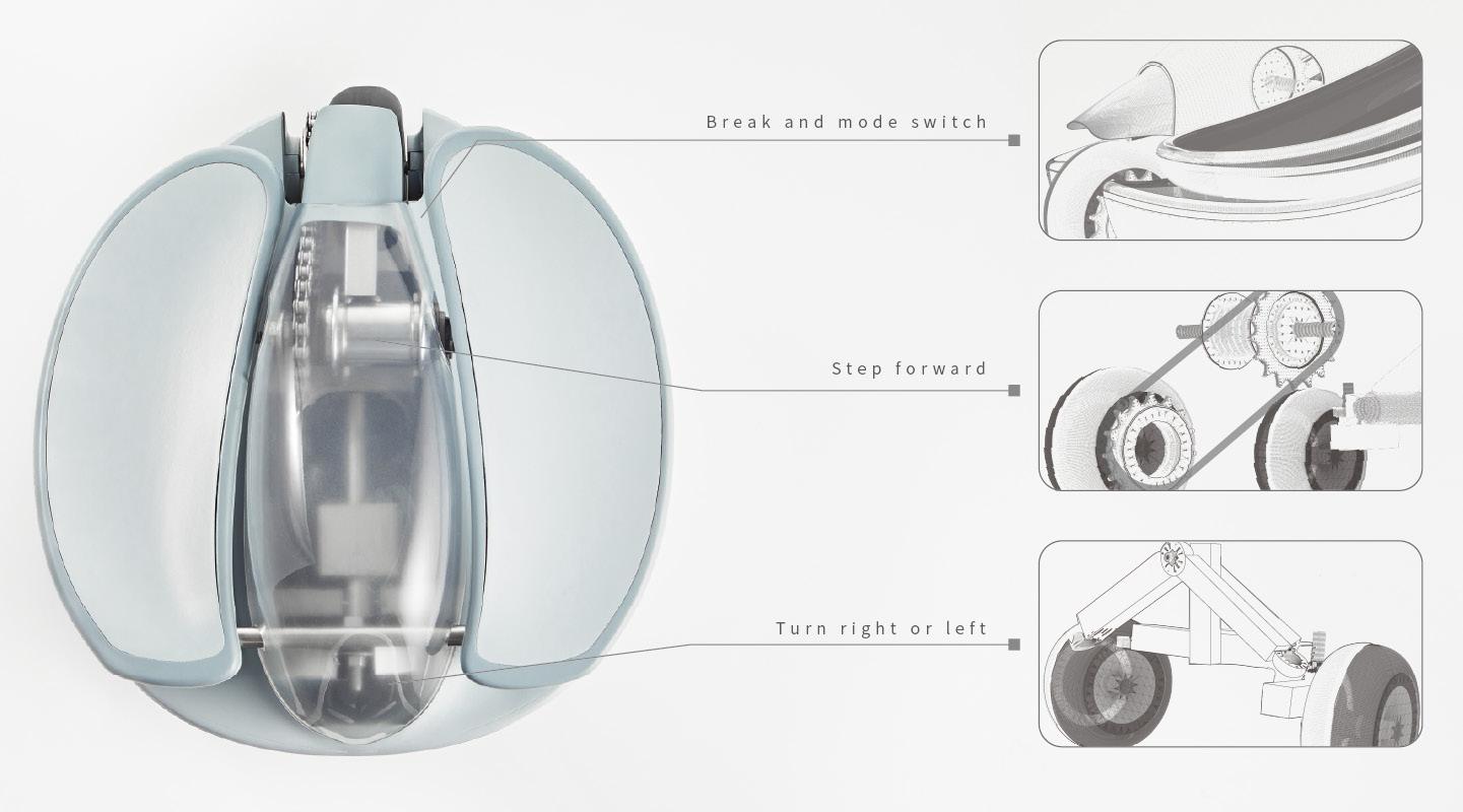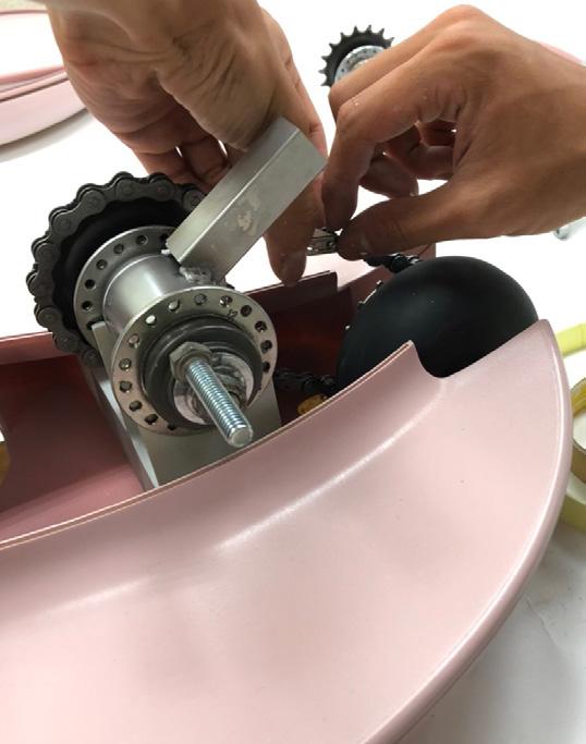 KAKA STEPPER has a mechanism that consists of three main parts: the chain and linkage to move the stepper forward, the tramping structure that increases resistance, and a mechanism that allows users to turn around.