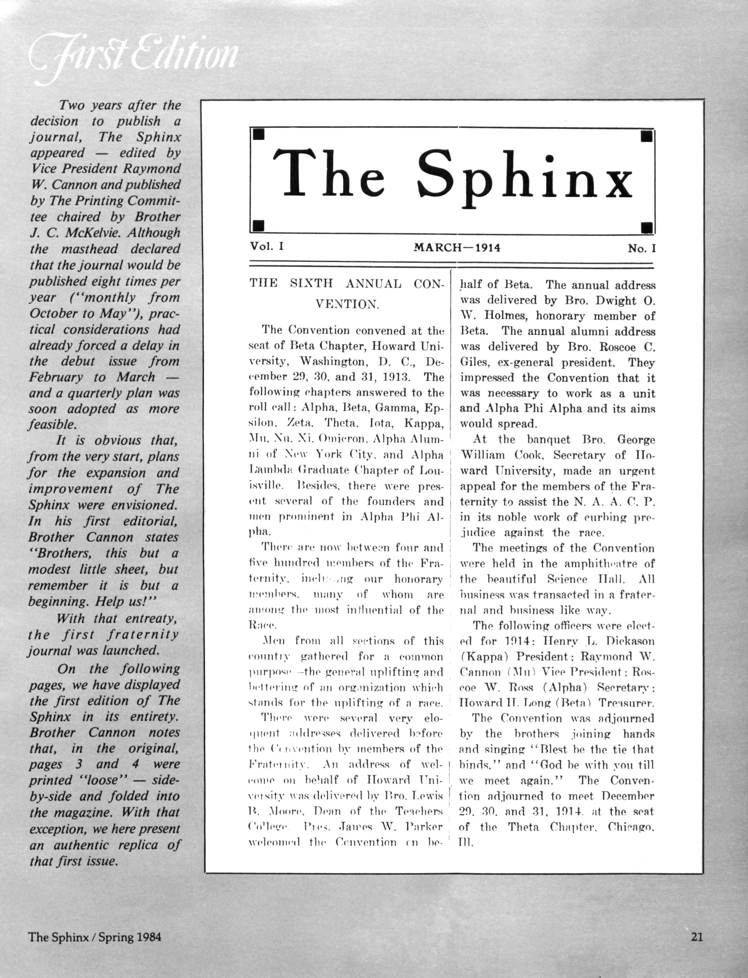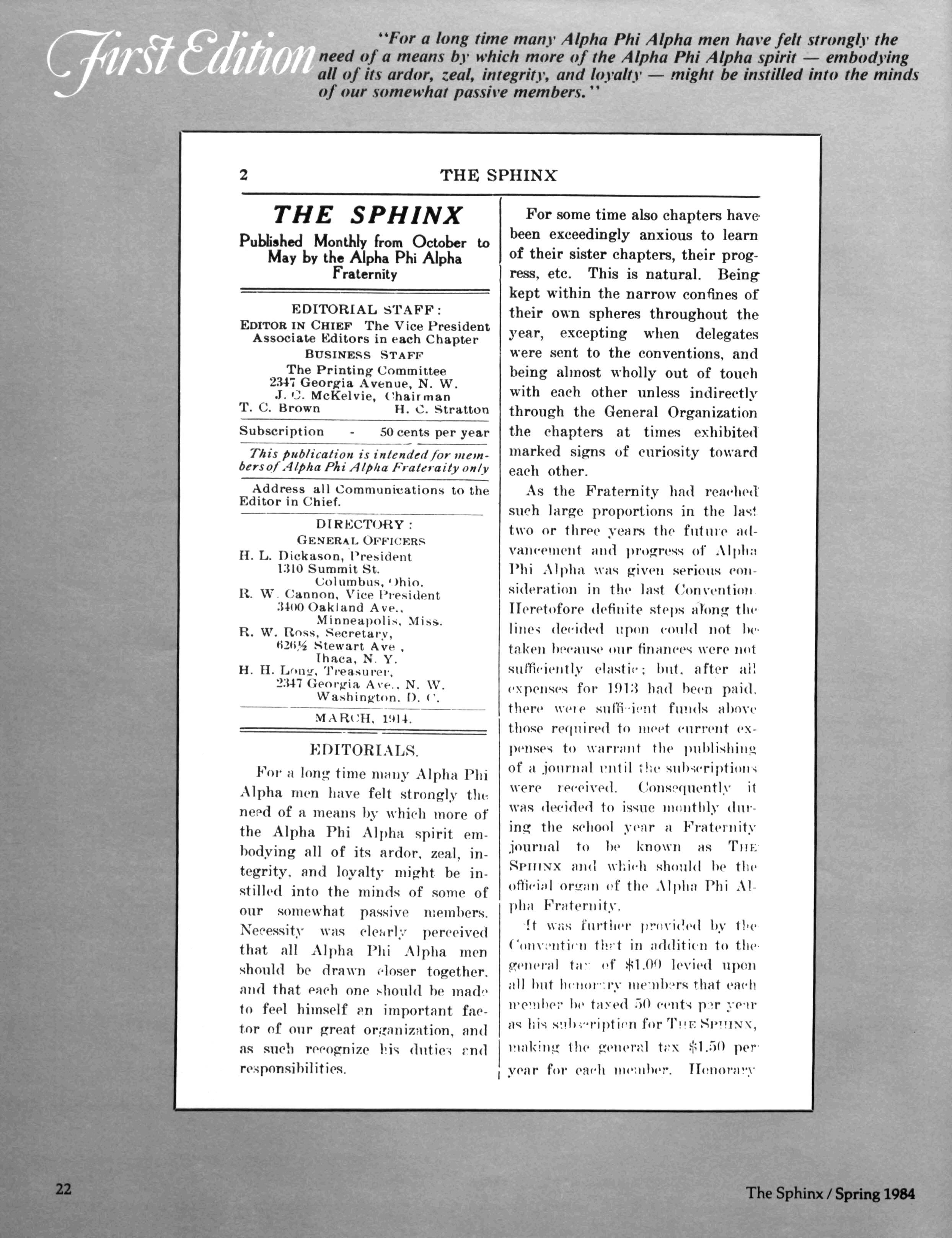 Two years after the decision to publish a journal, The Sphinx appeared — edited by Vice President Raymond W. Cannon andpublished by The Printing Committee chaired by Brother J. C. McKelvie. Although the masthead declared that thejournal would be published eight times per year ("monthly from October to May"), practical considerations had already forced a delay in the debut issue from February to March — and a quarterlyplan was soon adopted as more feasible.