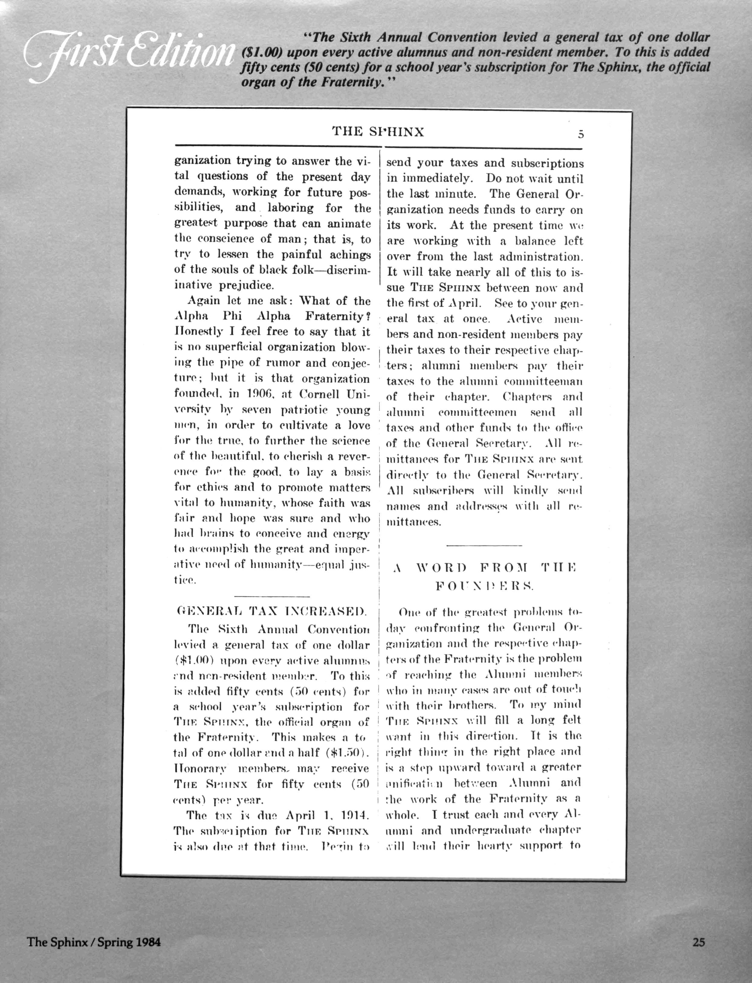 "The Sixth Annual Convention levied a general tax of one dollar ($1.00) upon every active alumnus and non-resident member. To this is added fifty cents(SO cents)for a schoolyear's subscriptionfor The Sphinx, theofficial organ of the Fraternity. "
