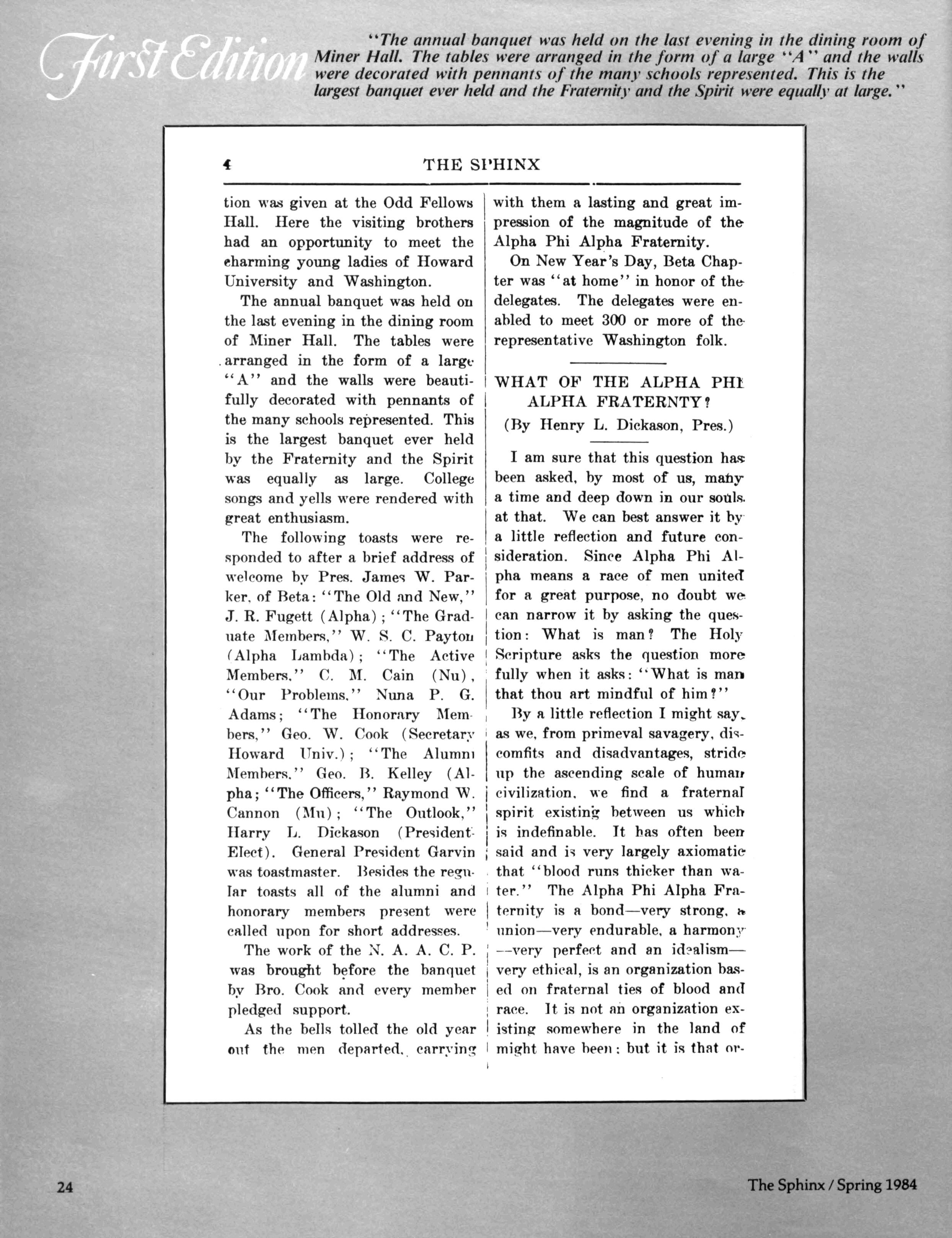 "For a long time many Alpha Phi Alpha men have felt strongly the need of a means by which more of the Alpha Phi Alpha spirit — embodying all of its ardor, zeal, integrity, and loyalty — might be instilled into the minds of our somewhat passive members. "