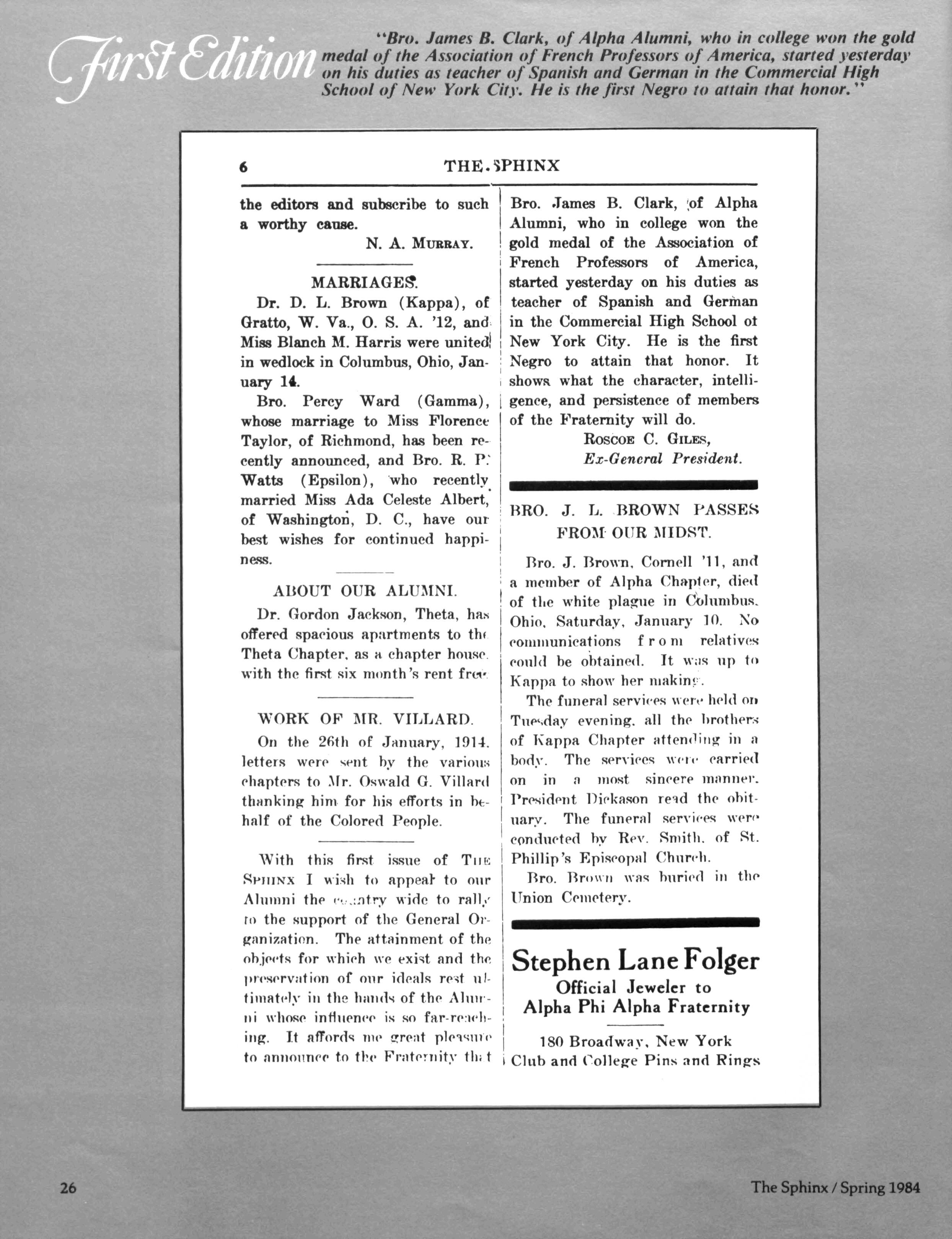 "Brothers, the success or failure of The Sphinx in its purpose liesin the ands of each and every Alpha Phi Alpha man. Will you give it your support, contribute to its columns, manifest an intense interest in it, andfoster it in its infancy, or will you merely stand by and see it succumb to the terrible stings of indifference. M