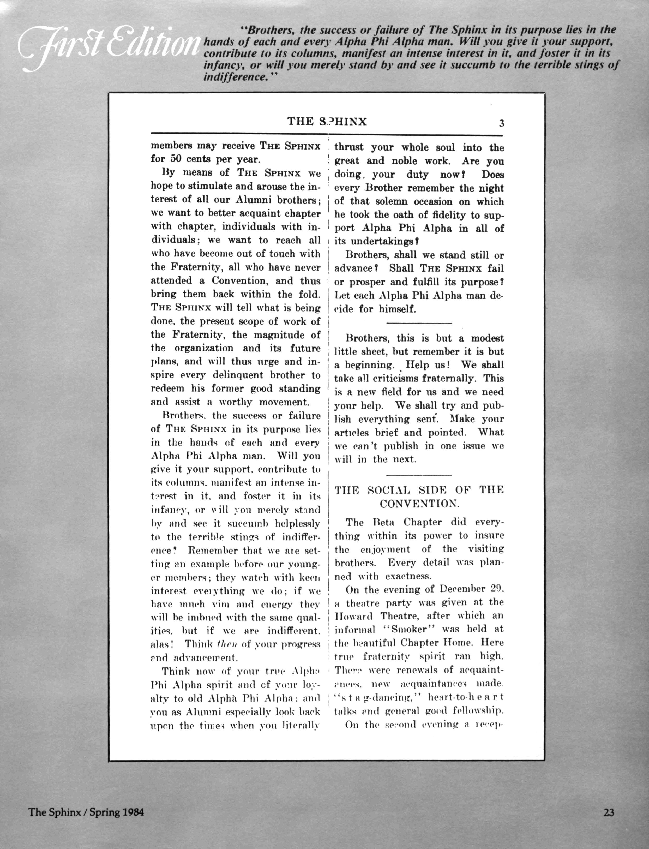 By means of THE SPHINX we hopetostimulateandarousetheinterest of all our Alumni brothers; wewanttobetteracquaint chapter with chapter, individuals with individuals; we want to reach all whohavebecomeoutoftouch with the Fraternity, all whohavenever attended a Convention, and thus bring them back within the fold